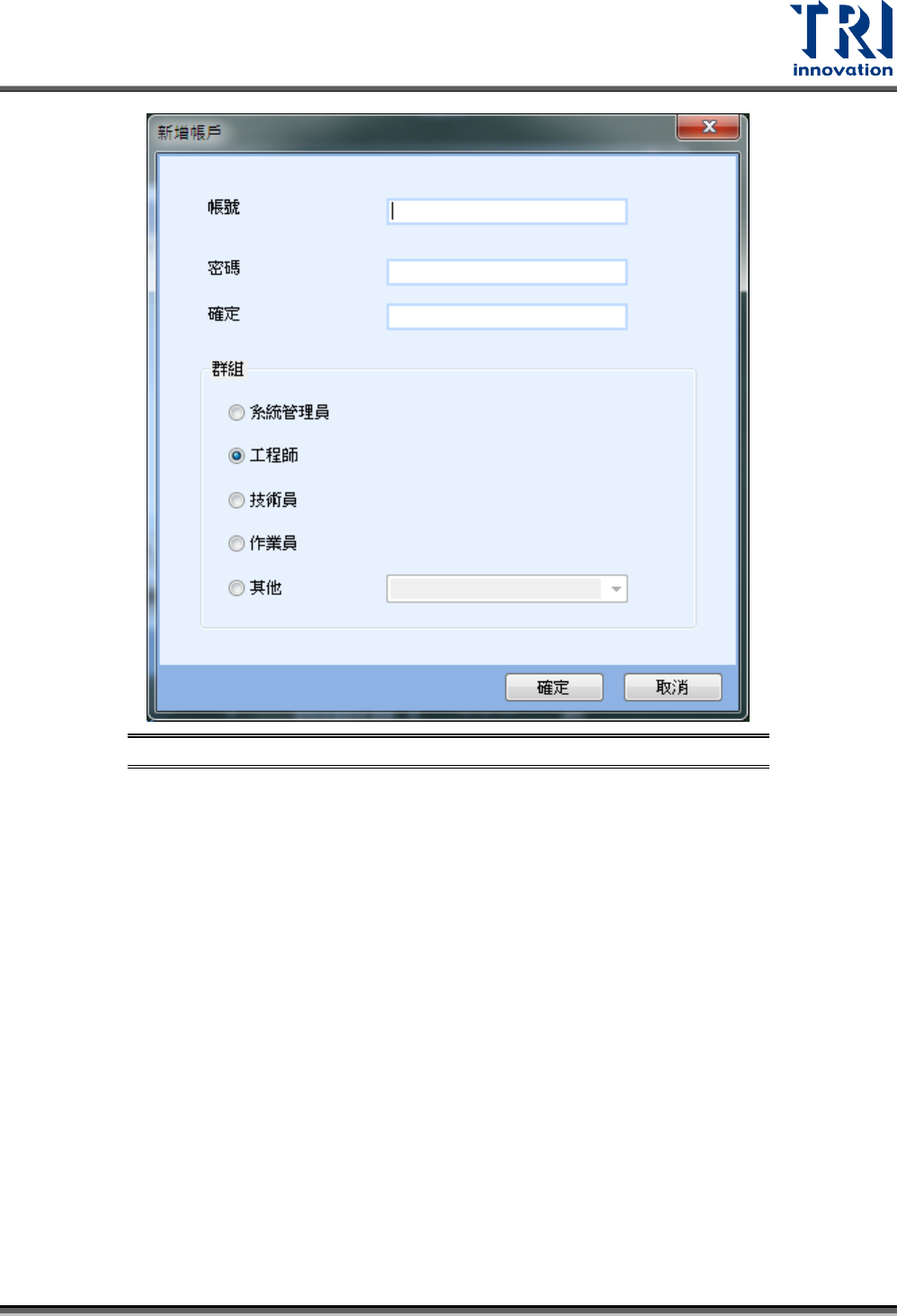 Test Research, Inc. TR7500Q E User Gu ide – S o f twar e 200 圖 306 :新 增帳戶視窗 刪除:可將建立的帳號 刪除,預設的四個 帳號無法刪除。 群組變更:可將以建立 的帳號變更群組。