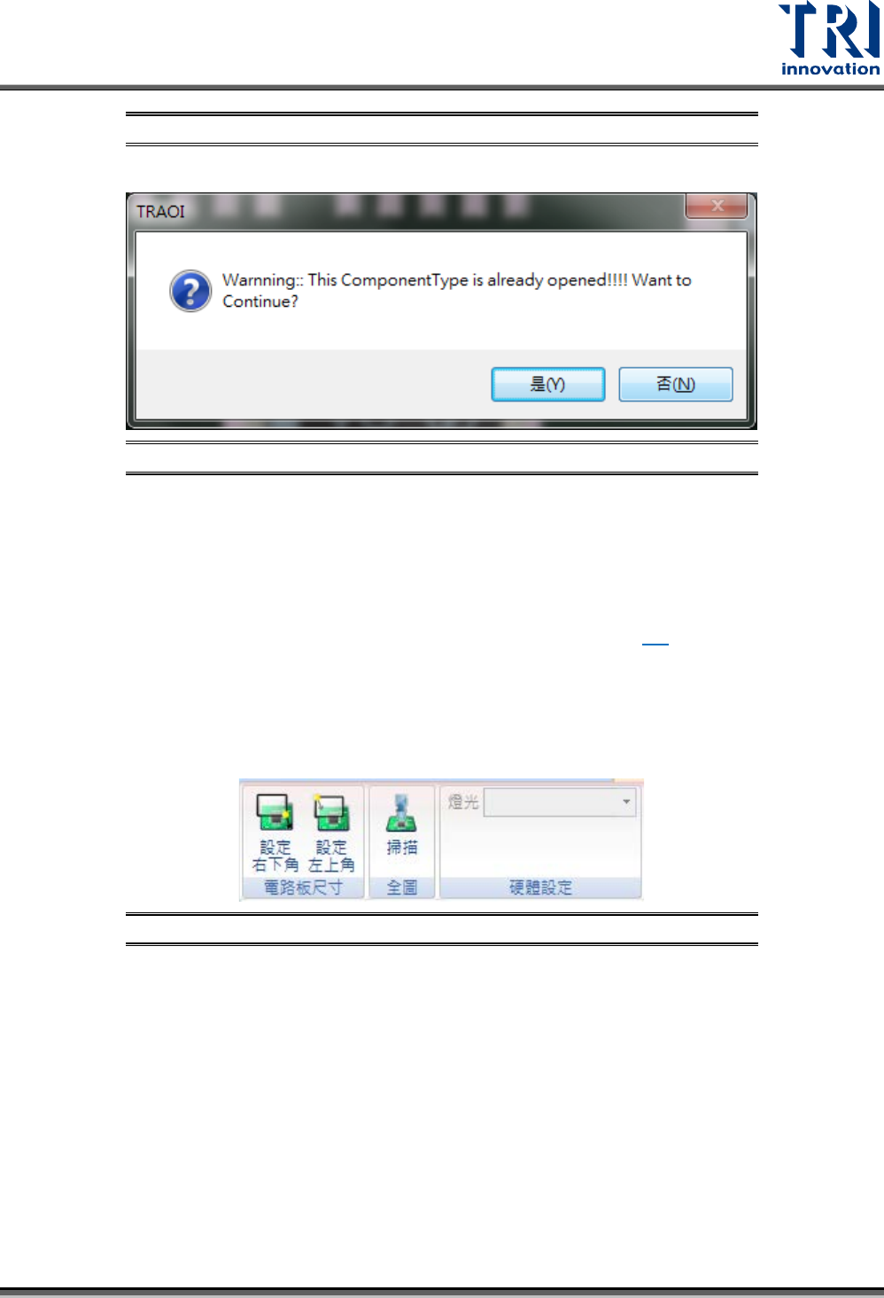 Test Research, Inc. TR7500Q E User Gu ide – S o f twar e 221 圖 341 :協 作資料庫 – 資料庫路徑確認 視窗 如發生編輯相同元件庫 時會出現警告訊息 。 圖 342 :協 作資料庫 – 編輯相同元件庫 警告視窗 報廢子板 – 自動不測:開啟報廢子 板自動不測功能。 – 缺陷率 (%)>= :設定檢測板元件的缺陷率 上限。當檢測板的 錯誤率超過此設 定值時,系統 …