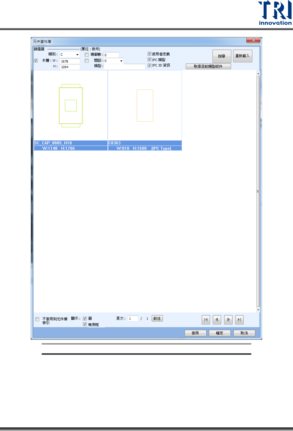 – 此類別:可手動開啟資料庫來做搜尋。可依據名稱、導腳數量、本體大小、間距來搜尋資