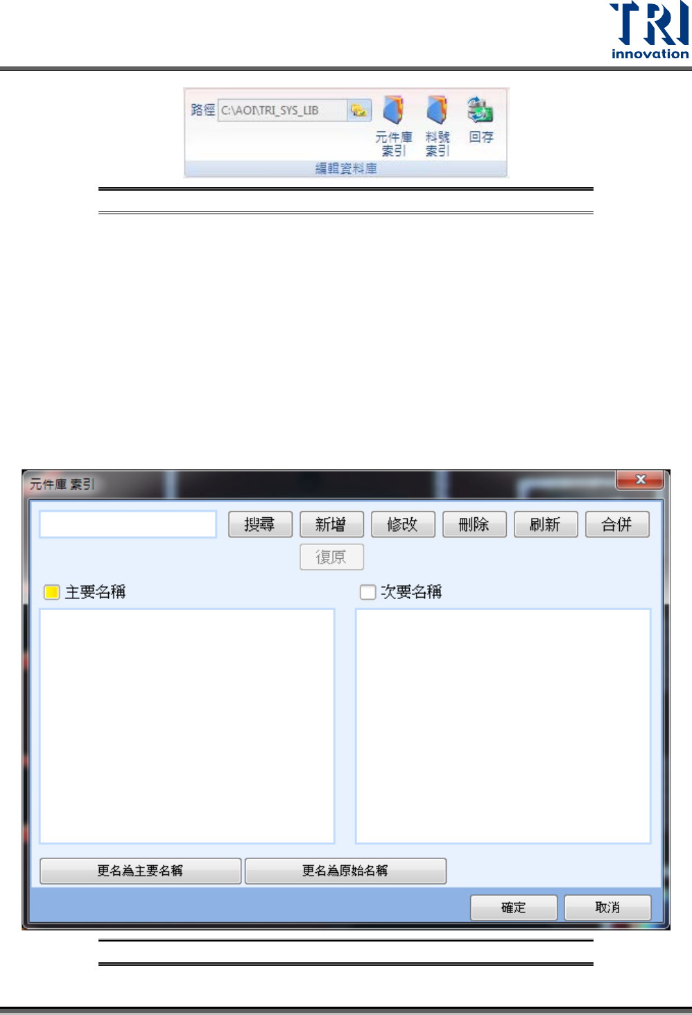Test Research, Inc. TR7500Q E User Gu ide – S o f twar e 261 圖 415 :元 件資料庫視 窗 – 全部: 可將指定路徑 的資料庫手動載入 所有的元件資料庫 。 匯出 – 此類別:匯出指定類別 的資料庫。 – 全部:匯出所有的元件 資料庫。 編輯資料庫