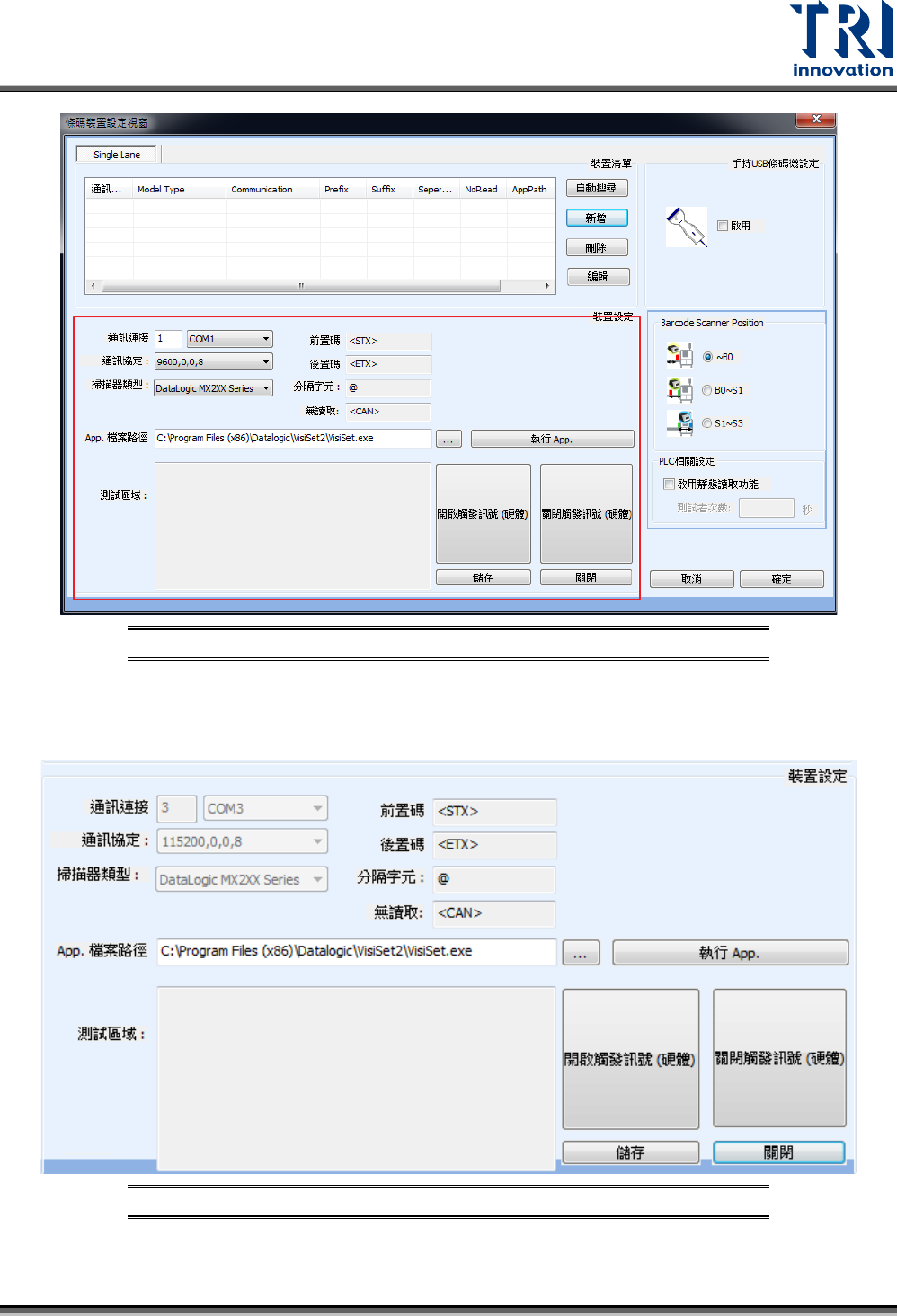 連接埠、前置碼、後置碼、分格字元、無讀取字串,App路徑。