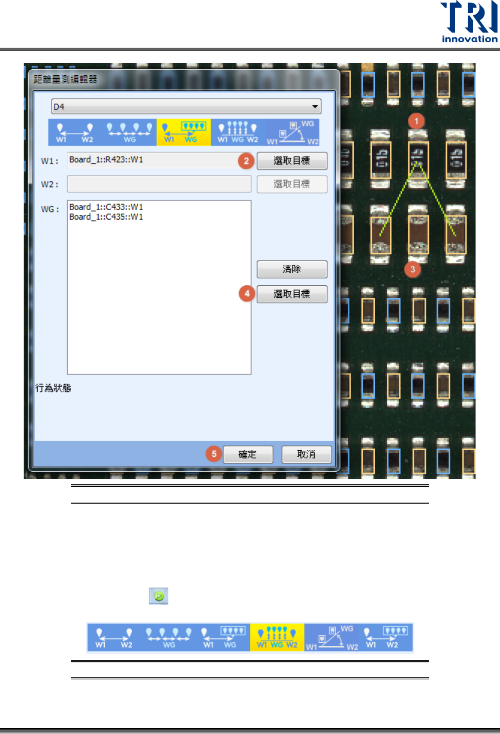 Test Research, Inc. TR7500Q E User Gu ide – S o f twar e 316 − 使用方式 圖 499 :距 離量測 – 多個 元件設定步驟 步驟 1. 在全圖模式上選擇多個 元件 。 ( 使用 Ctrl 鍵進行多選 ) 步驟 2. 點選 [ 距離編輯器 ] 中 WG 欄位的 [ 選取目標 ] ,此時所選取的元件會被 套到欄位裡。 步驟 3. 選擇 [ 確定 ] 即完成設定。 步驟 4. 按下…