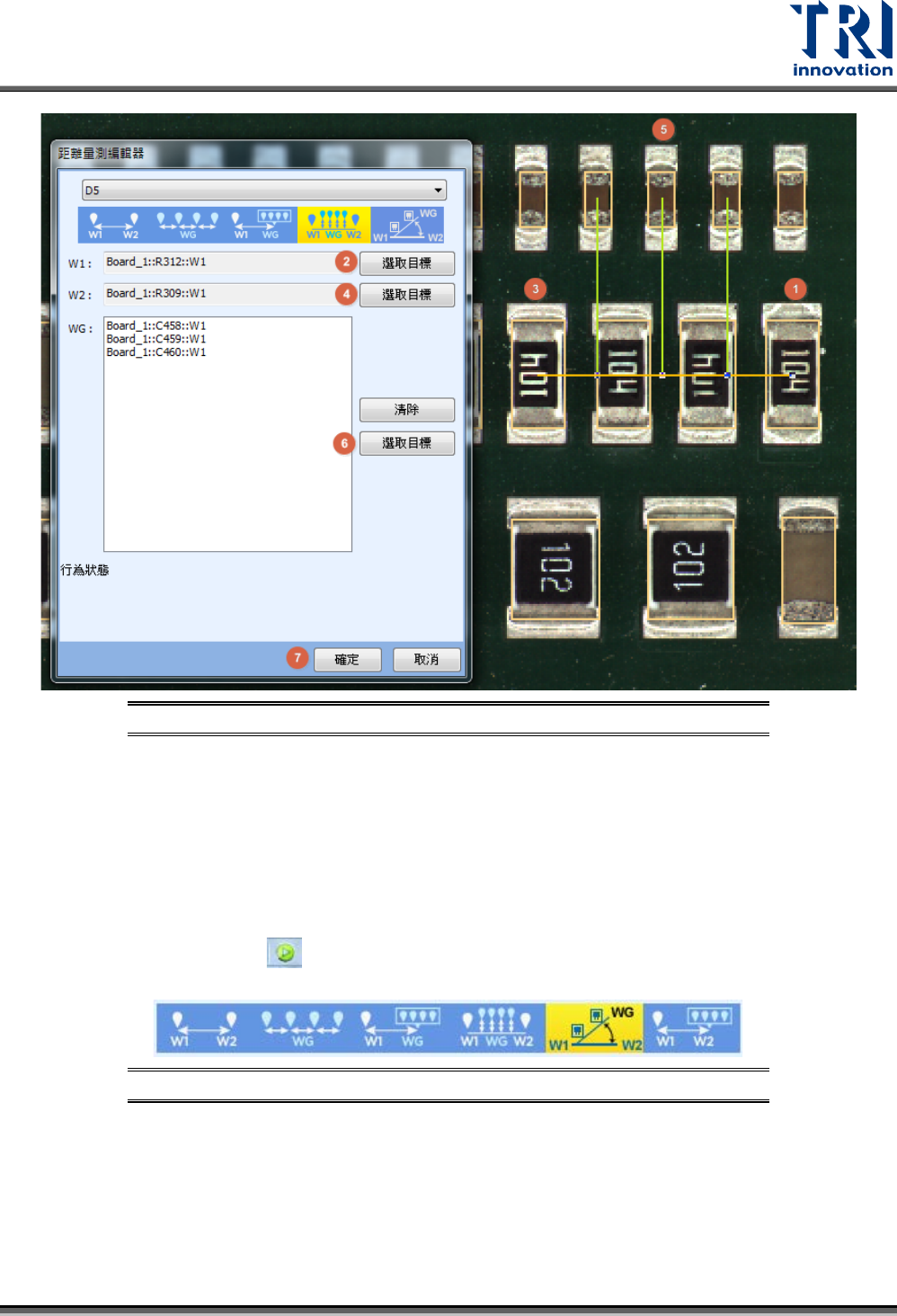 Test Research, Inc. TR7500Q E User Gu ide – S o f twar e 318 圖 503 :距 離量測 – 多個元件 到另外兩 個元件所繪 出直線距離 量測設定步 驟 步驟 1. 在全圖模式上選擇一個 元件 。 步驟 2. 點選 [ 距離編輯器 ] 中 W 1 欄位的 [ 選取目標 ] ,此時所 選取的元件會被套到欄位 裡。 步驟 3. 在全圖模式上選擇另一 個元件。 步驟 4. 點選 [ 距…