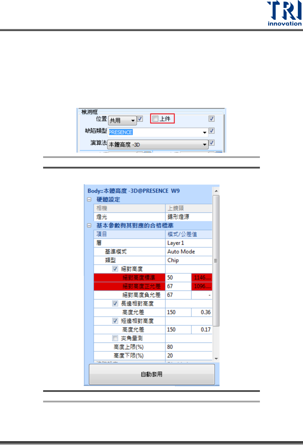 步驟3. 將絕對高度設定為沒有元件的高度,使檢測框檢測結果為不良。