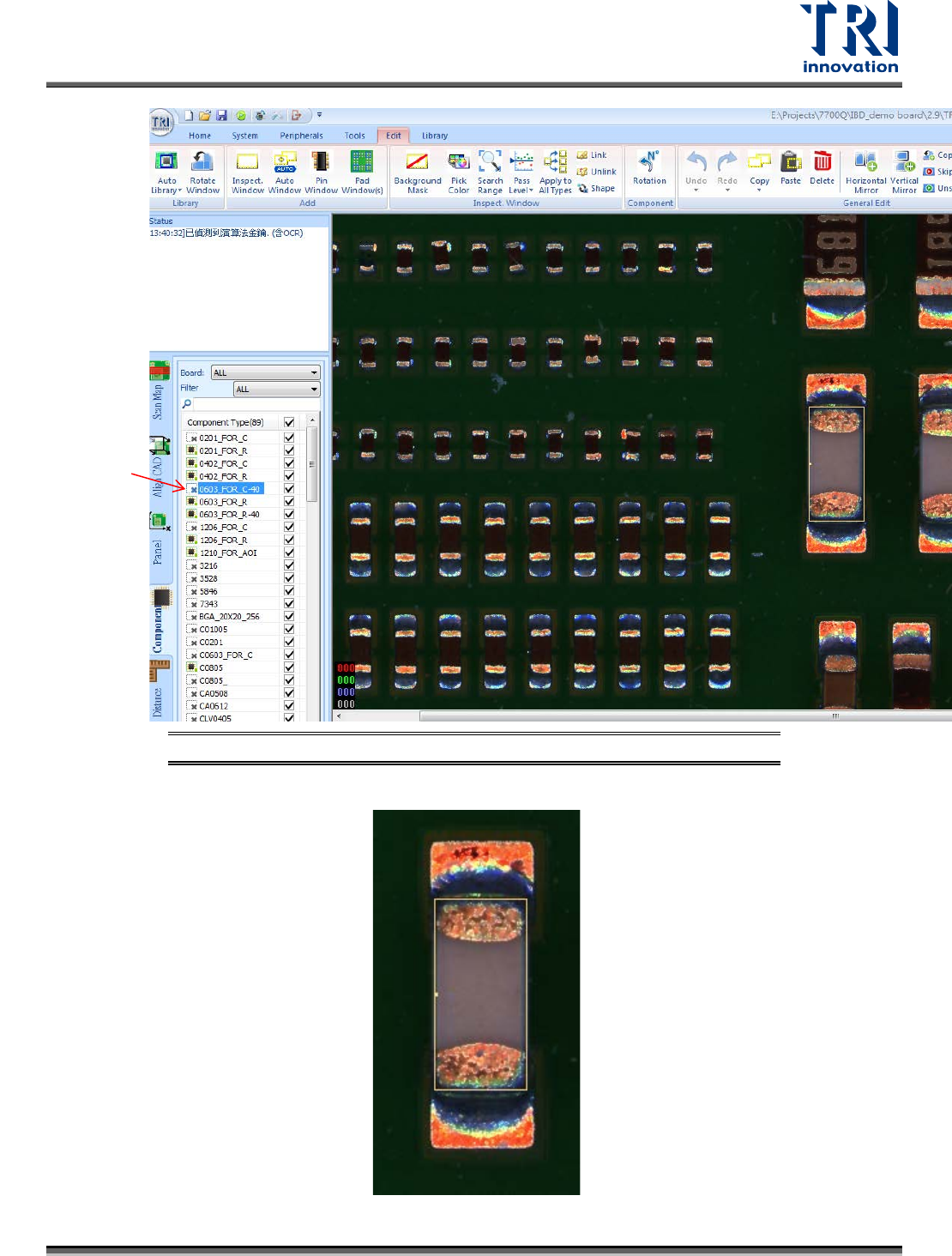 Test Research, Inc. TR7500Q E User Gu ide – S o f twar e 40 備註:元件類型後方的 方格,一般情況下 是勾選的,其代表 修改的檢測框參 數在存檔時,會 回存到元件資料庫。若 取消勾選,則修改 的檢測框參數僅在 此專案,而不會 影響回存到元件 資料庫。 檢測條件設定面板: 提供檢測框 測試相關的設定, 例如:檢測框的演算法 、缺 陷類型、邏 輯 … 等。前方的方格, 一般情況下…