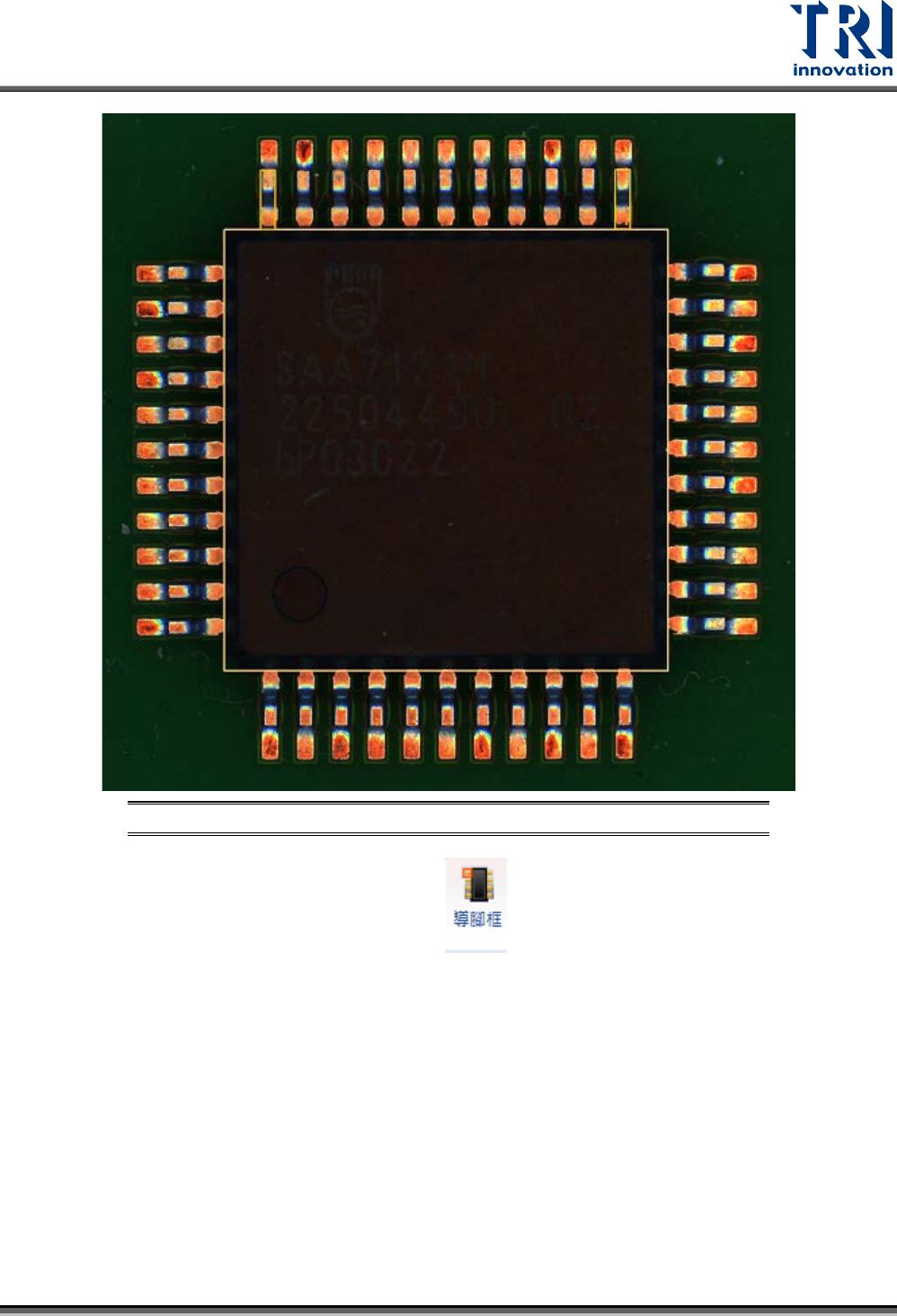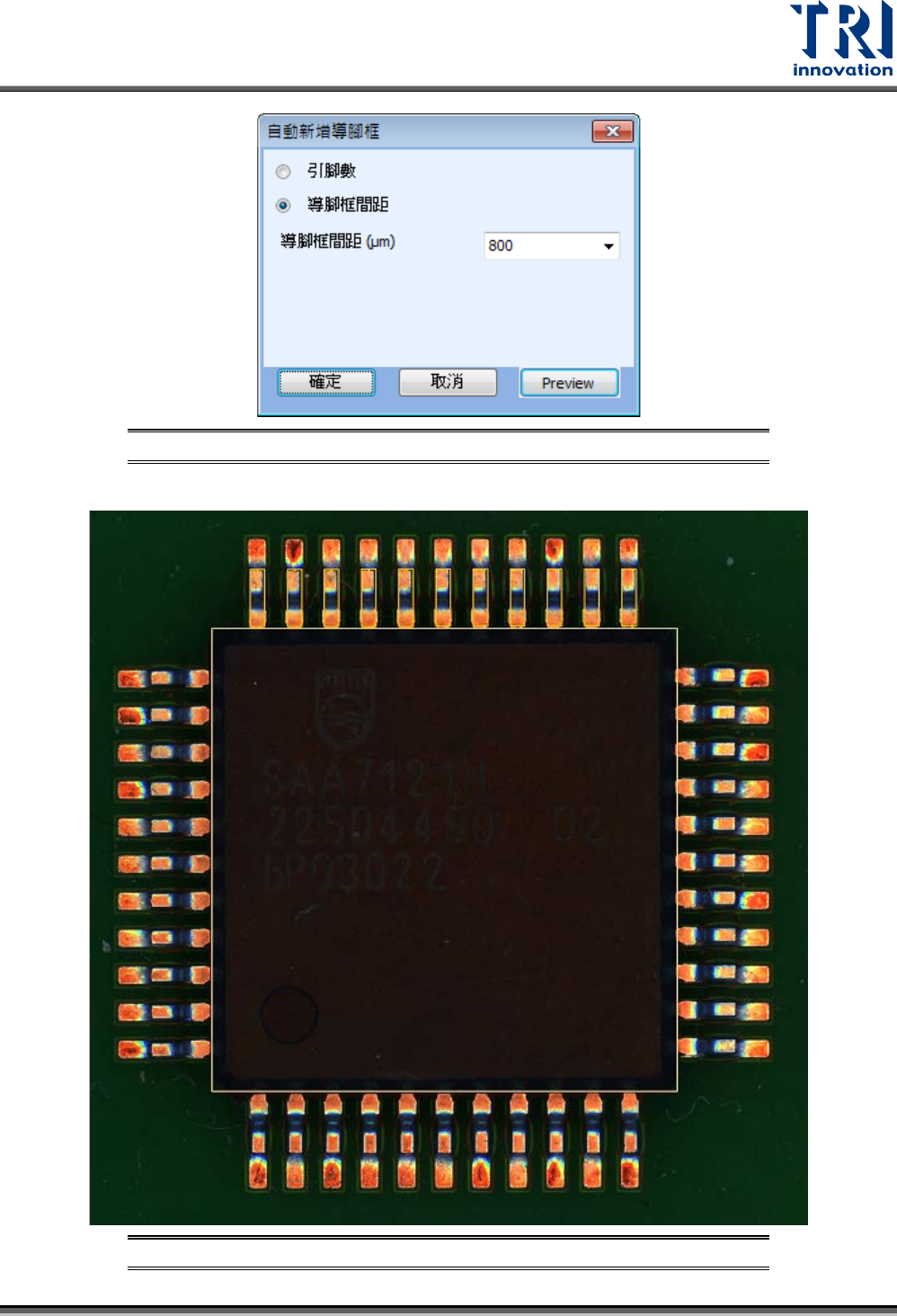 Test Research, Inc. TR7500Q E User Gu ide – S o f twar e 46 圖 71 :編輯 元件資料庫 – 積體電路 (IC) 元件 – 水平鏡射 產生導腳 框 步驟 10. 點選這兩個導腳框後, 再次按下 。 步驟 11. 此時系統會自動跳出增 加導腳框的視窗。 一般而言,系統會 依據本體大小自 動計 算腳的數量, 並產生在介面上 ,然後按下 “ 確定 ” 來新增 。若導腳框的間距 不對,…