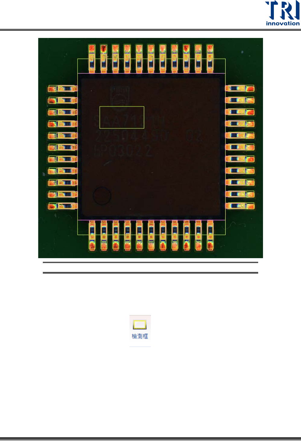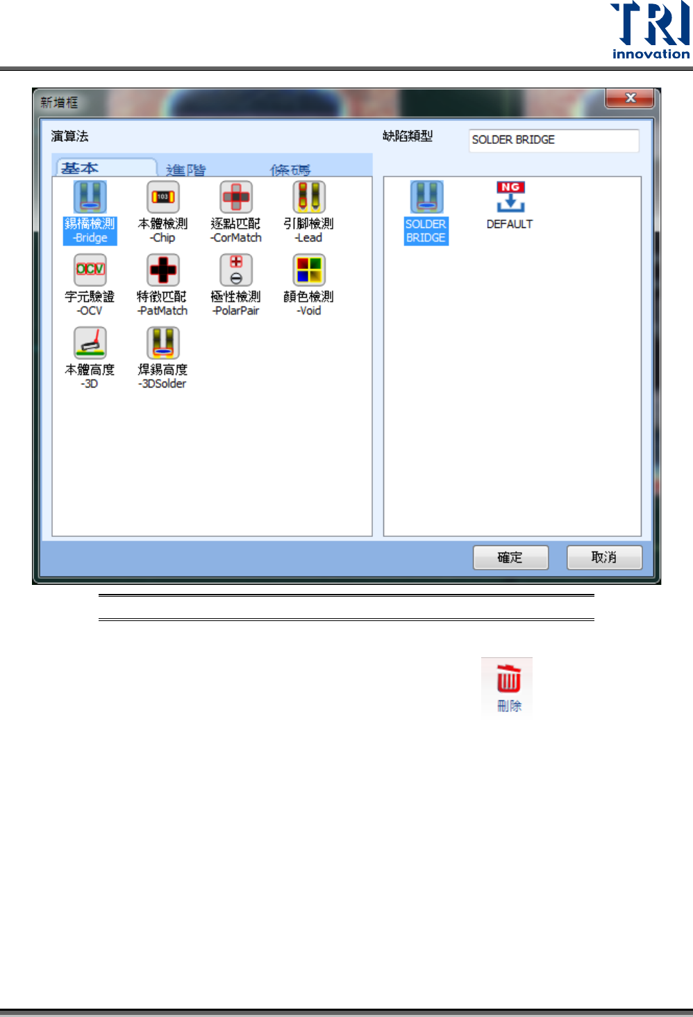 Test Research, Inc. TR7500Q E User Gu ide – S o f twar e 51 圖 77 :新增 檢測框設定 視窗 步驟 4. 使用者需先選擇想要的 檢測框演算法和缺 陷類型後,按下 [ 確定 ] 。 步驟 5. 若要刪除檢測框,可以 點選欲刪除的檢測 框後,按下 或者熱 鍵 [Del] 來刪 除。 步驟 6. 接著,調整每個檢測框 的大小與參數,來 達到該檢測框所要 檢測的項目。