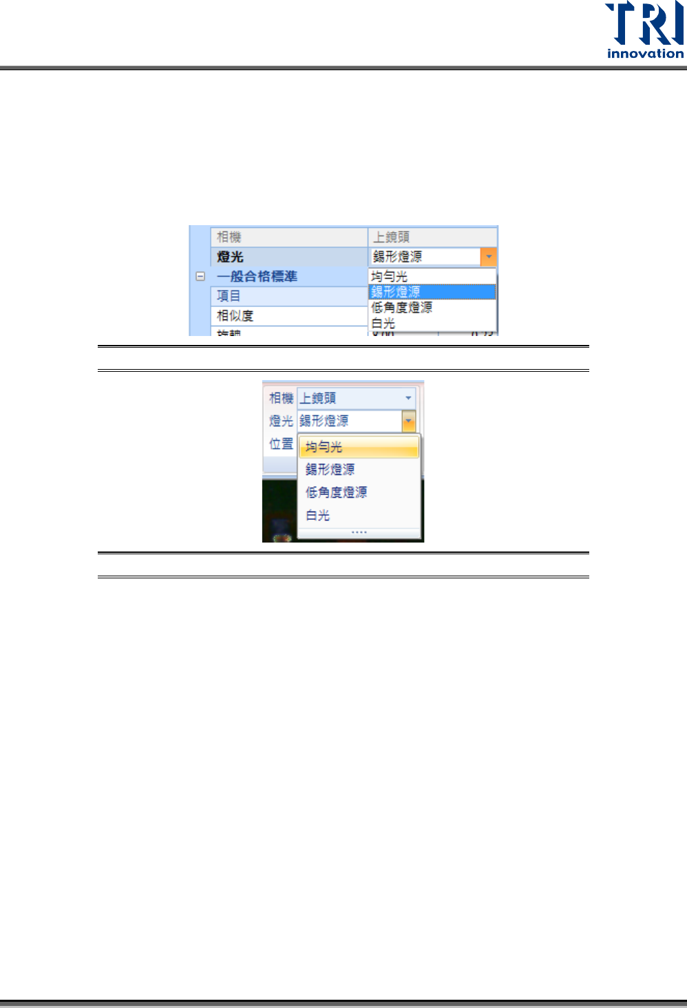 檢測框參數設定面板”中”硬體設定”的”燈光”進行切換檢測光源的動作。若只是要切換影像圖區的
