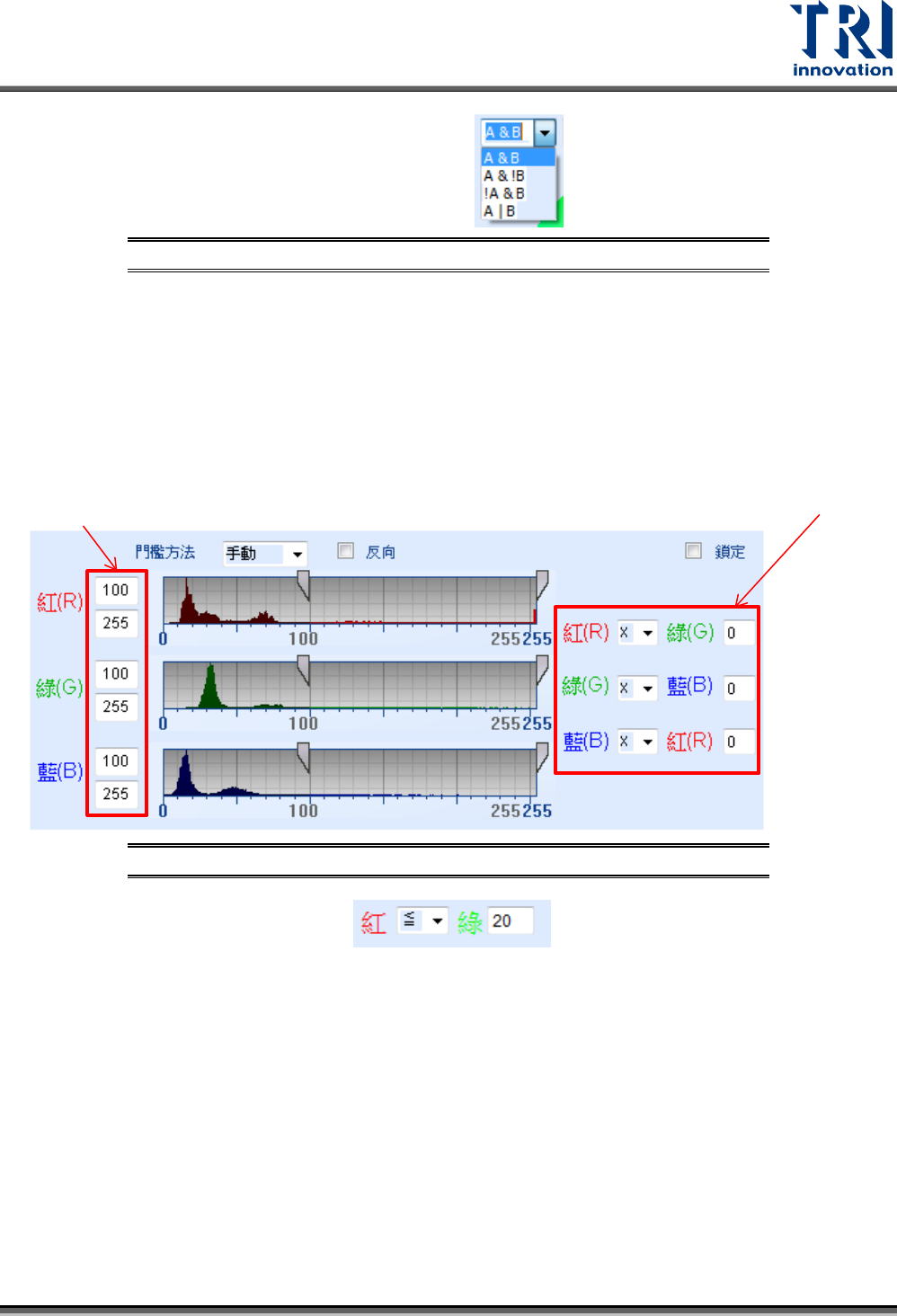 Test Research, Inc. TR7500Q E User Gu ide – S o f twar e 67 圖 103 :色 彩空間調整 區 – 預設權重 門檻方法:設定門檻的切 割方式,詳細請參閱權 重法。 反向:選擇與所設定相反 的色彩空間。 AB 邏輯:使用集合論的方式來選取亮度分佈統 計直方圖與色彩空 間區。 集合論 的邏輯說明如下 – 交集: AND ,數學符號 ⋂ ,代表僅擷取兩 者同時成立的區段 ,…