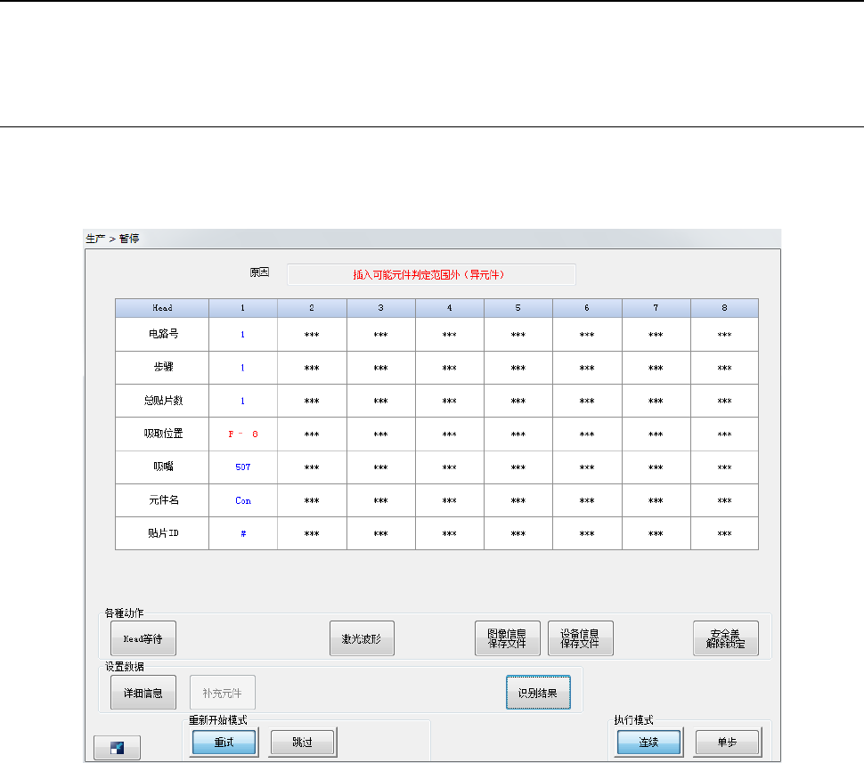 在生产程序的「元件数据(检查页面)」, 进行引脚矫正所设定的元件矫正处理失败时,暂停并显示下