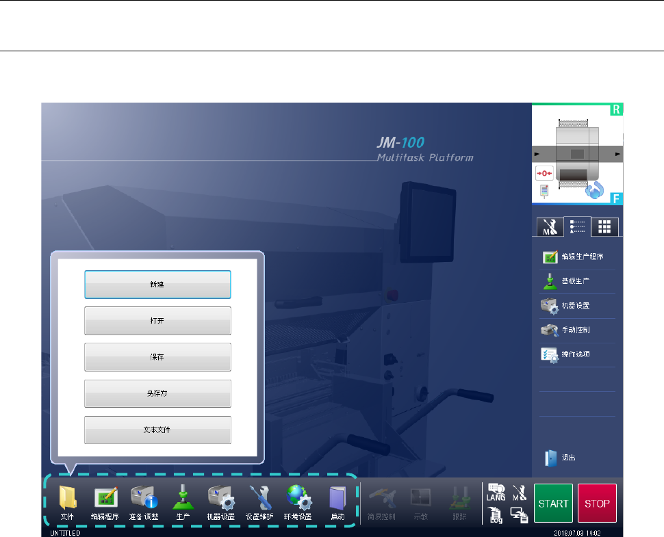 操作手册 1- 11 1-4- 3 操作方法 1-4- 3 - 1 选择命令 选择操作区域的菜单 ( 蓝点线框内 ) ,可选择命令。 上图为在主画面 中选择 [ 文件 ] ,显示子菜单 的示例。 从子菜单内选择任意 命令按钮,即可执行命令。 上述主要 命令 的执行方法:按信息区域 里的菜单快捷 按钮,即可执行命令 。 如果应用程序在执行 过程中,必需先退 出执行中的应 用程序,才能执行选 择的命令。
