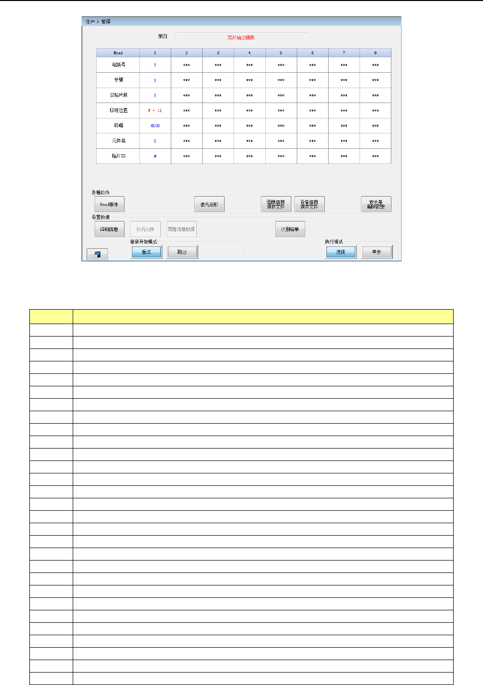 操作手册 4-2 显示 4-2- 1 (1) 原因 显示的暂停原因,列 表如下。 No. 原因 1 不暂停 2 STEP 生产 3 按 <STOP> 开关,用户要 求 4 安全盖(安全罩) 打开 5 供料器台架下降 6 检测到传送带浮动 7 气压下降 8 标记识别错误 9 无元件 10 元件保护 11 重试列表 12 选项关联 13 其他生产错误 14 芯片站立错误 15 激光识别错误 16 搬送错误 17 激光头弄脏 18…