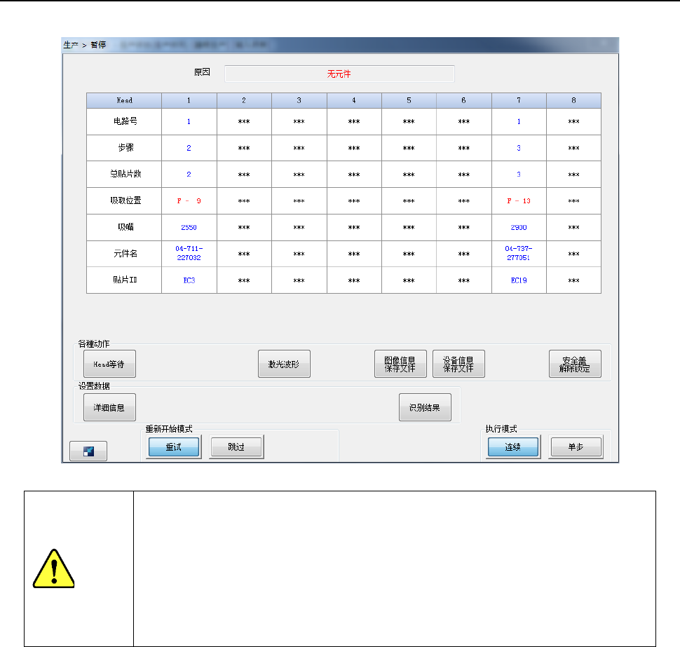 操作手册 4-5 4- 3 无元件 发生时的概要 4-3- 1 从供应装置吸取元件 时发生重试超限时, 即判断为发 生了 「无元件」 。 如果在操作选项中 勾选了 [ 发 生无元件时暂停 ] 选项,则发生无 元件时会暂停生产 、并显示暂停 画面。 如果未勾选,则会查 找代替供料器并继 续生产。如果 不能继续生产,则会 显示重试列表。 ● 在操作选项里勾选 [ 发生无元件时 暂停 ] ,发生无 元件时 ,将暂停 生产,显示暂停画 面。 如…