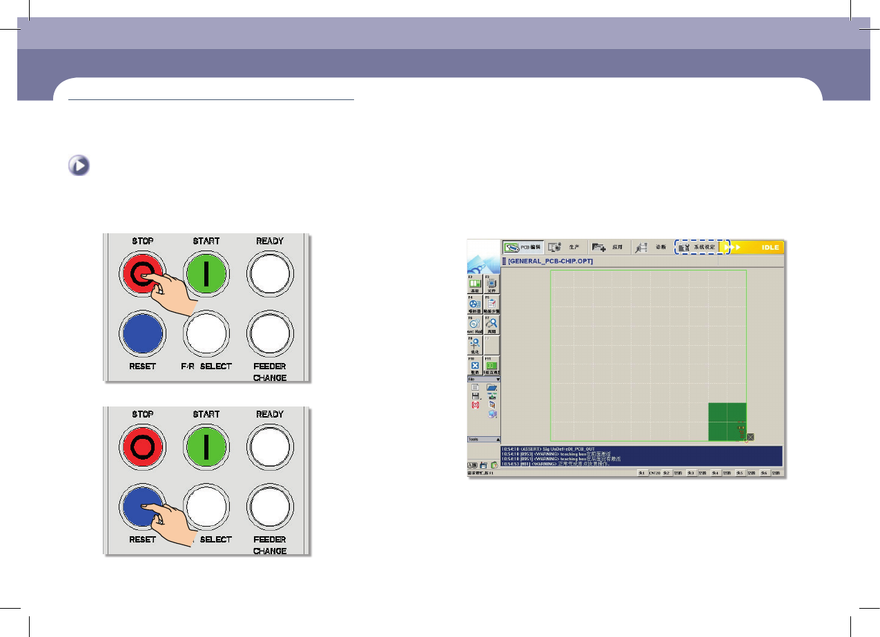 结束生产及更改作业 Chap ter 5 Advanced Mult i- Func ti onal Place r DE CAN L 2 O pe ra tio n H an db oo k 5-4 本 Chapter 介绍结束生产的方法、转换到新作业的方法、生产完毕后关闭( OFF )设备电源并且整理设备周边的方法。 SMT In-Line 过程 > 结 束生产 及 设备停 止 SMT In-Line 过程 结束生产及更改作业…