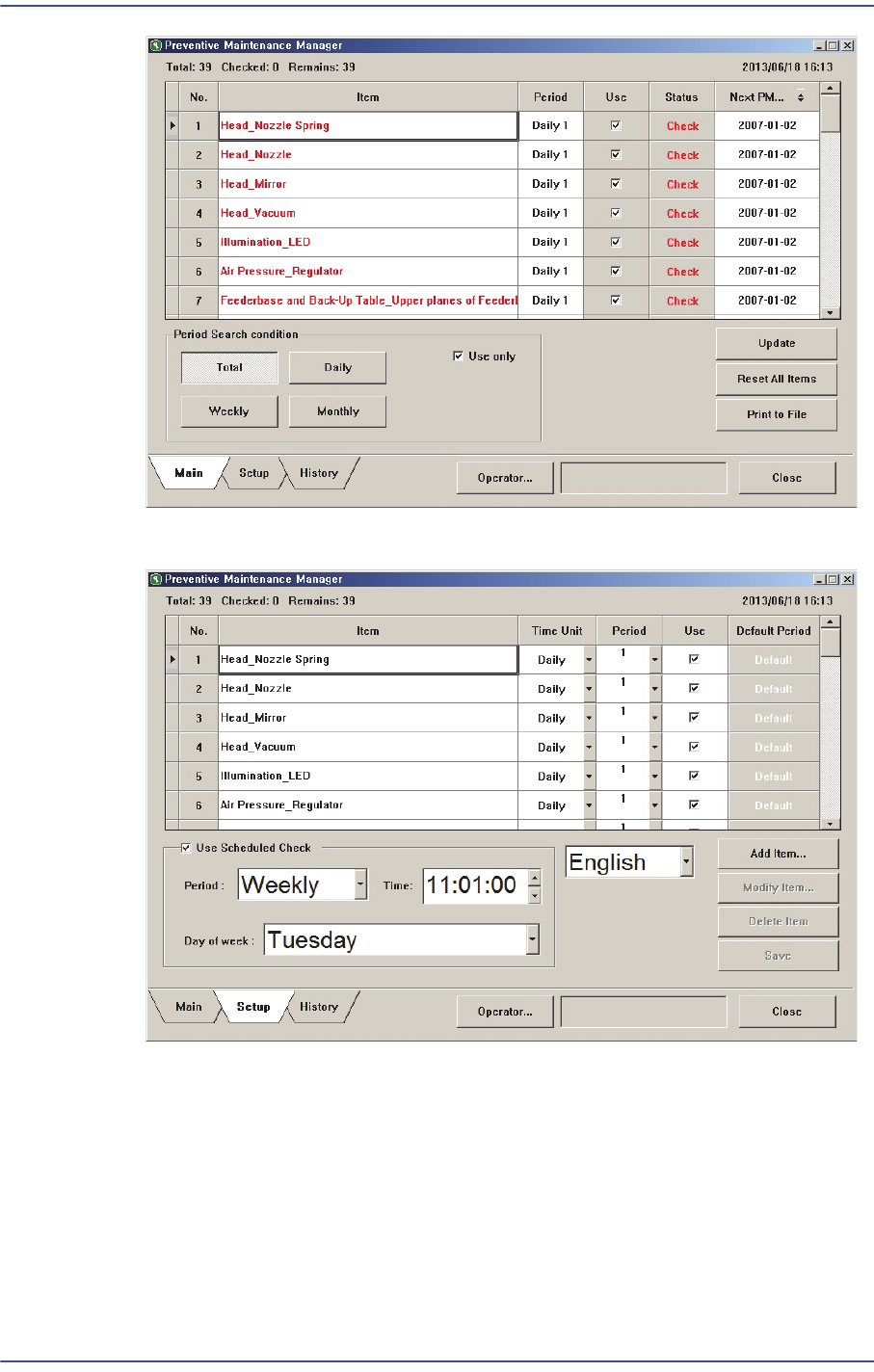 13-37 Software 13.2.3. Main Screen configuration 1) T oday’ s Check Item V iew For the items to be inspected today , the <Check> button is indi cated in red in the <Status> column. For the items that do n…