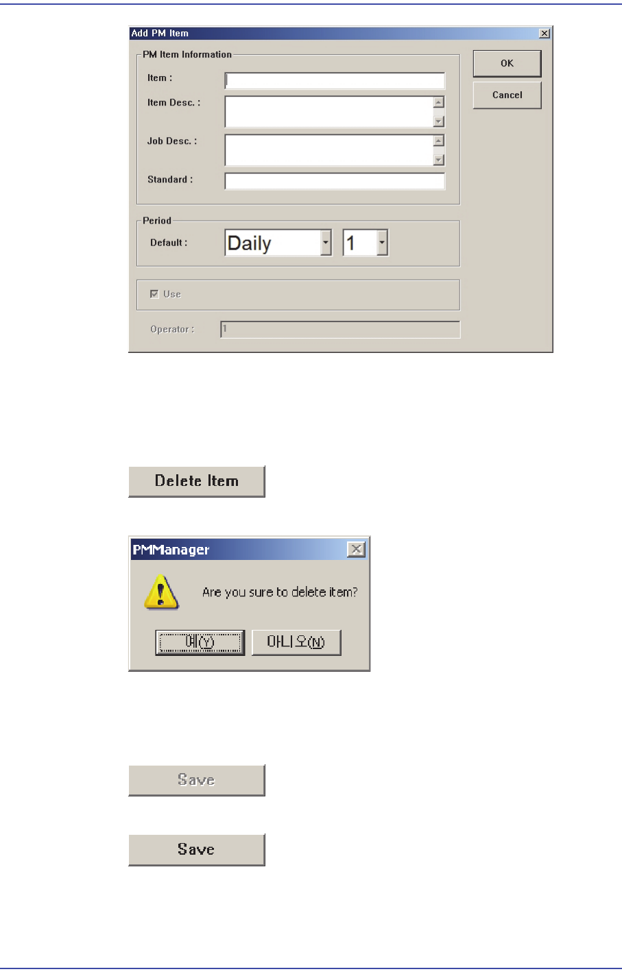 13-45 Software 6) Deleting User Check Item The registered user check item can be modified. This can be performed in the following manner . Click the <Delete Item> button. Click the <Y es> button to de let…