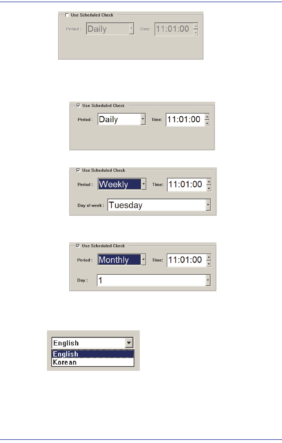 The time for scheduled check can be set in the following manner.
