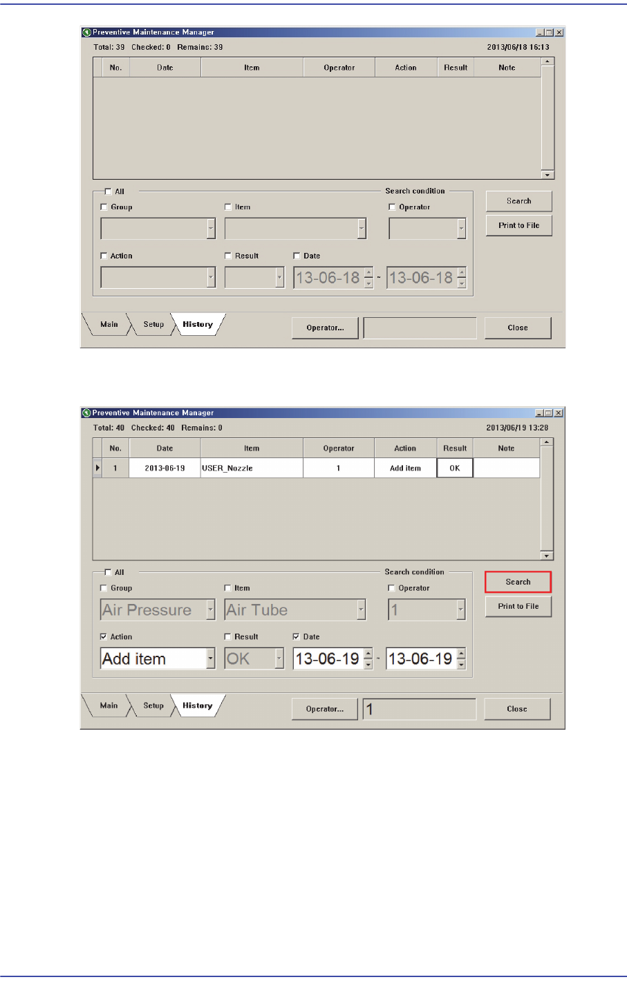 When inquiring the check history, input the search condition and click the <Search>