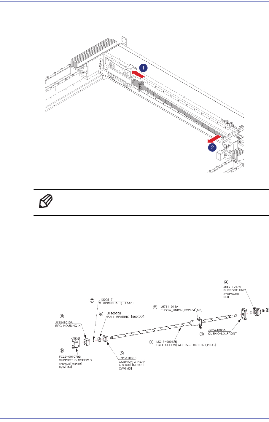 4-7 X Frame 7) Remove the ball screw by inclining it so that it is not damaged due to collision with other modules. 8) Replace the Ball Screw with a new one. Ref The part number of the new Ball Screw is MC13-00 0125. 9) …