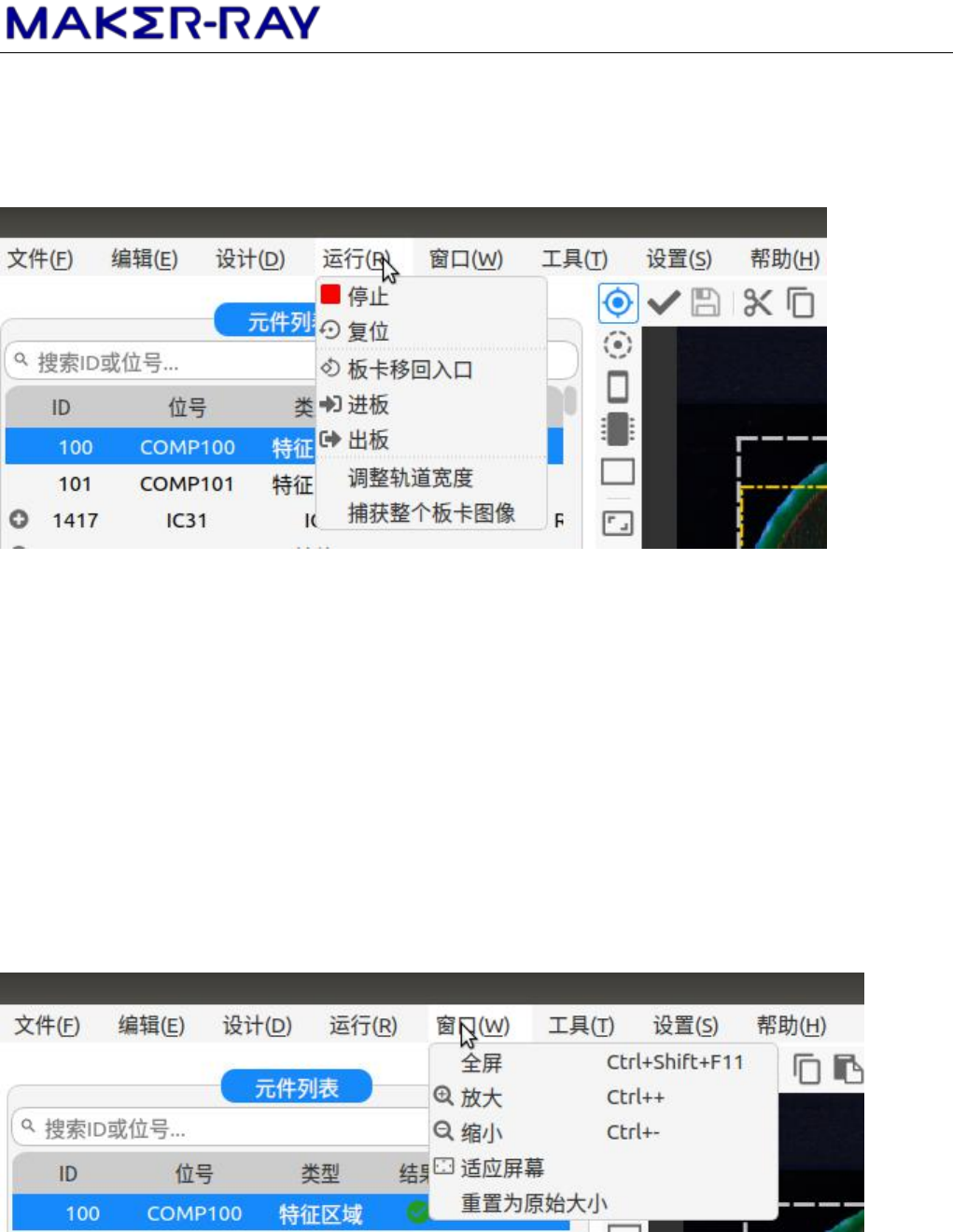 AIS400 操作手册 Rev:1.0 版权镭 晨所有, 本文档内 容属商 业机密。 未经允 许,任何 组织或 个人不得 以任何形 式复制 和传播。 3. 导入 CAD:导入版式所有元件 C AD 坐标及元件料号等 4. 显示未编辑元件列表:显示版式中未建立标准的元件列表。 运行菜单: 1. 停止:软件停止测试。 2. 复位:复位机器(X/Y 及轨道归零)。 3. 板卡移回入口:将机器里的 pcb 板移到入口。 4. 进板:板子到达测试…