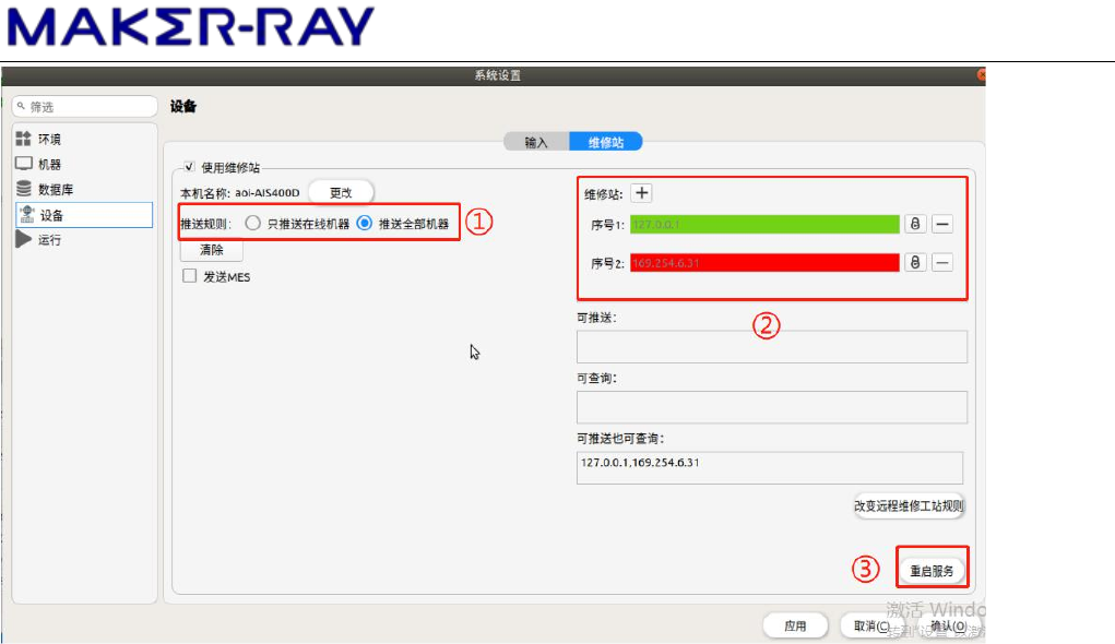 AIS400 操作手册 Rev:1.0 版权镭 晨所有, 本文档内 容属商 业机密。 未经允 许,任何 组织或 个人不得 以任何形 式复制 和传播。 1. 推送规则: 指设备测试完毕后测试结果 发送到本机或者其他 机器。 2. 维修站:发 送测试结果数据可选择本机 或其他电脑,发送本 机需要设置本机 IP . 默认 127.0.0.1 ,发 送到其他电脑,对应设 置其他电脑 IP 地址。 3. 重启服务: 选择发送本机或其他电脑, 设置…