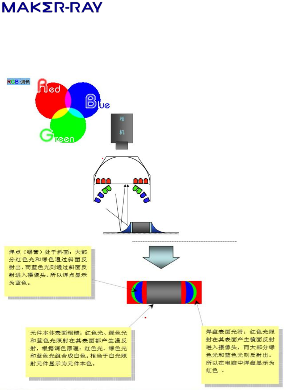 AOI 光源由红、绿、蓝、三种 LED 组成 2D 光:蓝色与黄色(调色原理:红色与绿色组合成黄色, 蓝