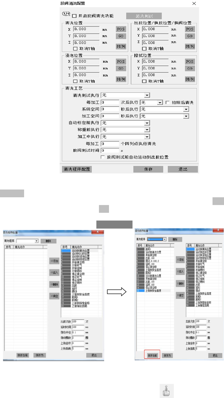统只提供运行至清胶位置的动作,清胶动作请点击 IO 测试栏中的 OUT1/OU2 出胶。