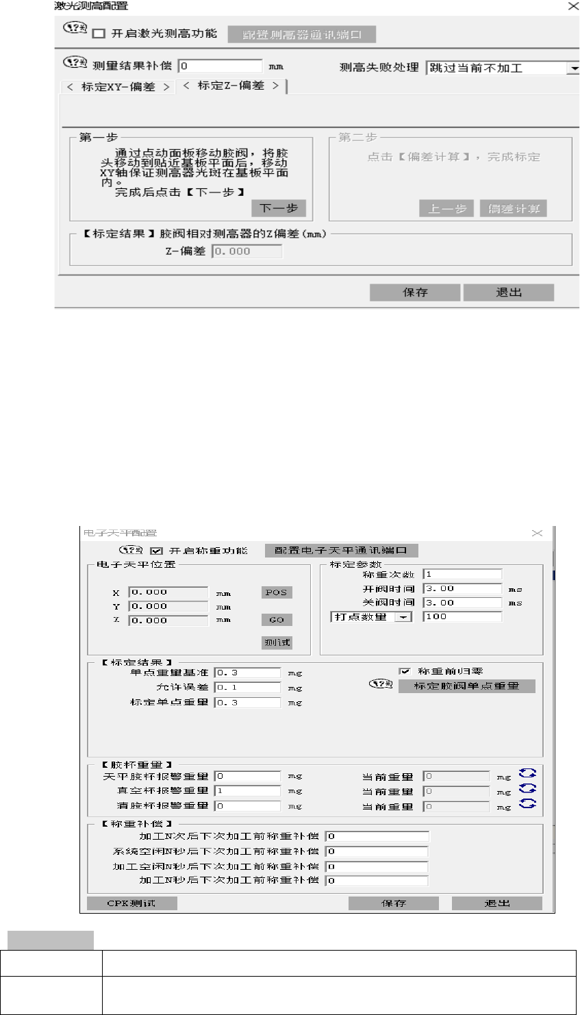 清胶位置 在清洗界面,可设 置清胶位置。该功能 主要应用于喷嘴需要持续 、长时间喷胶的应用场景 ,系 统只提供运行至 清胶位置的动作 ,清胶动作请 点击 IO 测试栏中的 OUT1/OU 2 出胶。 3.4.2 激光测高器配置 激光测高功 能: 主要通过测量产品涂 胶表面到激光头 之间的高度 差 h1 , 针头到涂胶表面的高 度 差 (该功能主要用于 针头点胶的功能 上, 且需要硬件支持 ) , 可实现加工过程 中测高自动调整 喷射阀 …