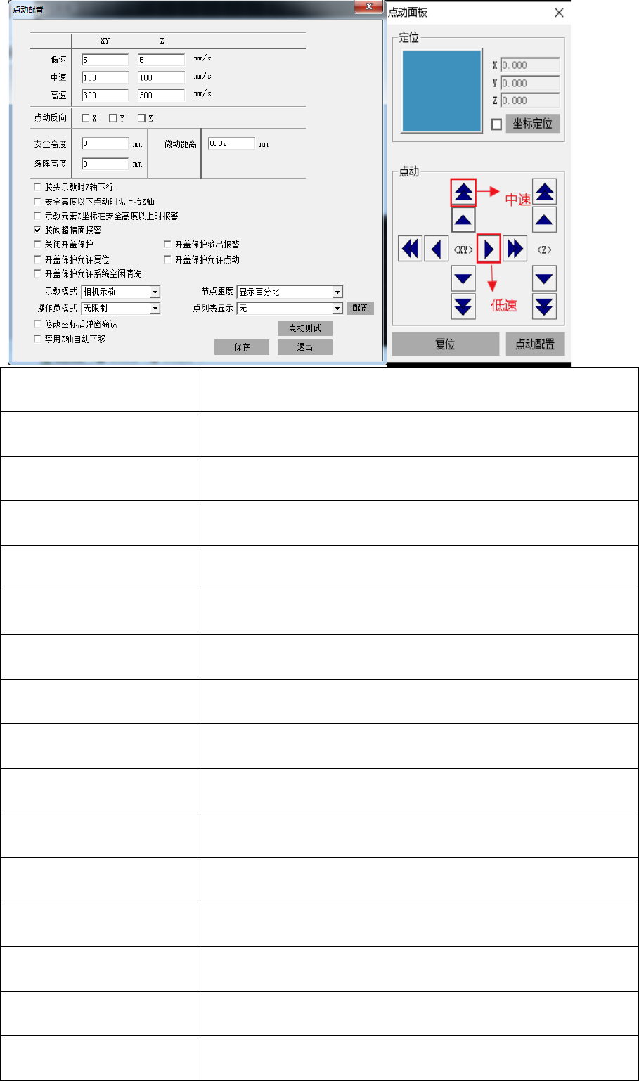 低、高、中速度 设置点动面板上 点动时, X YZ 轴 运动的速度。 点动反向 切换轴在点动运 行时的方向, 可根据个 人习惯设置 点动时轴运动的 方向。 安全高度 设置 Z 轴运行的 安全高度,默认 是 0 的坐标 。 微动距离 点动面板点一次 按键,轴所运动 的距离 缓降高度 当 Z 轴低于设置 的微动距离坐标 , 此时手动点动运 行时, 中速自动 切换为低速。 胶头示教时 Z 轴是否下行 在胶头示教模式 下,手动 g oto 到元…