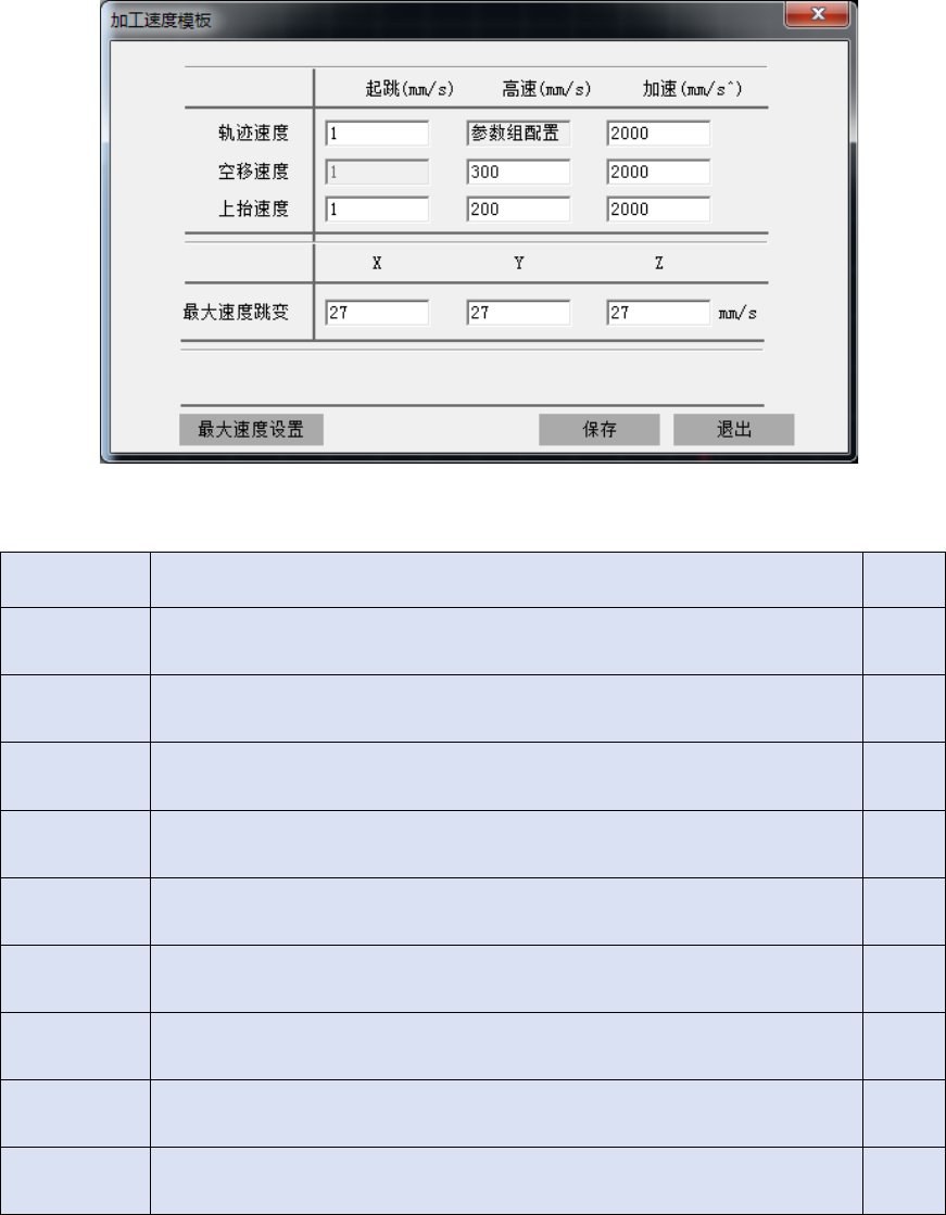 1 、系统默认 X/Y /Z 轴运动速度以及加 速度,更改此 处速度为新建加 工任务默认速度 。 名称 意义 单位 轨迹加速度 任务加工过程中 轴的加速度。 mm/s ^ 加工起跳速度 当轴初始速度( 零)跳变成恒速 时,代替零值 作为初始值的速 度。 mm/s 空移 速度 非加工状态时, 各个轴的运动速 度。此处也是 相机拍照 运动的 速度。 mm/s 空移 加速 非加工状态时, 各个轴由一个速 度跳变到另一 个速度的时间惯 量。 m…