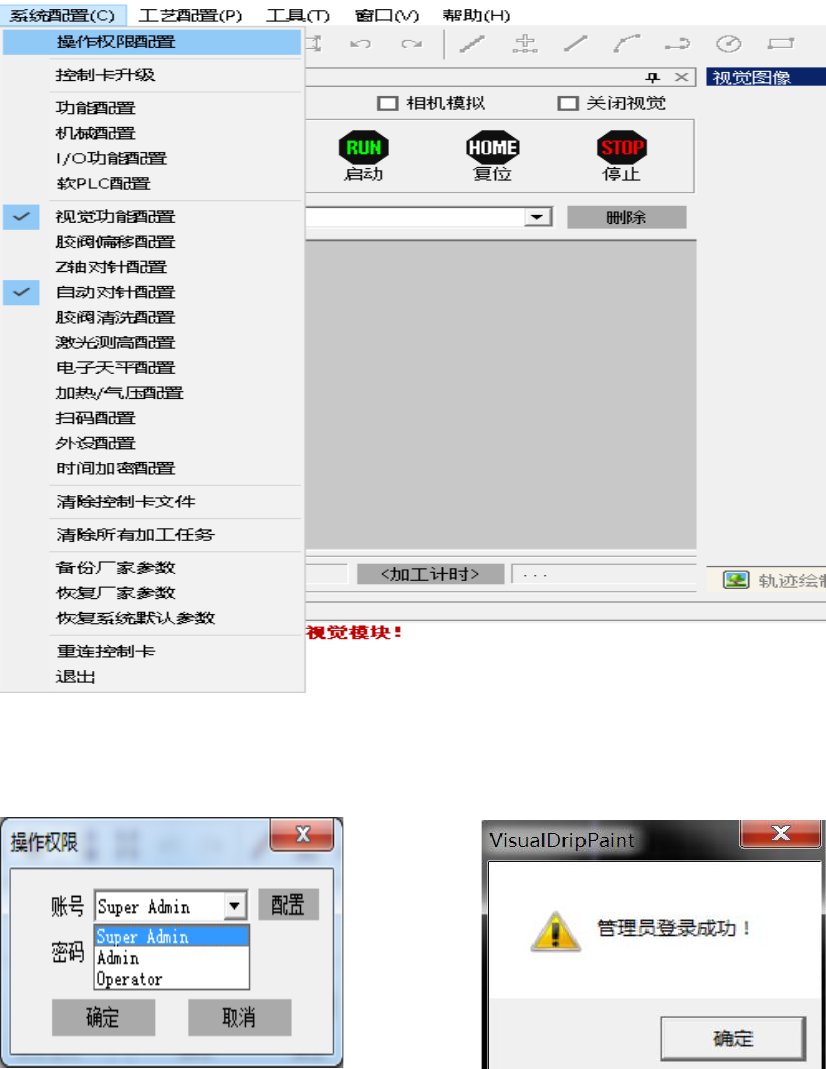3、 管理员模式下,操作者可执行软件上除系统设置外的(机器配置、回零配置、IO 功能配置)其