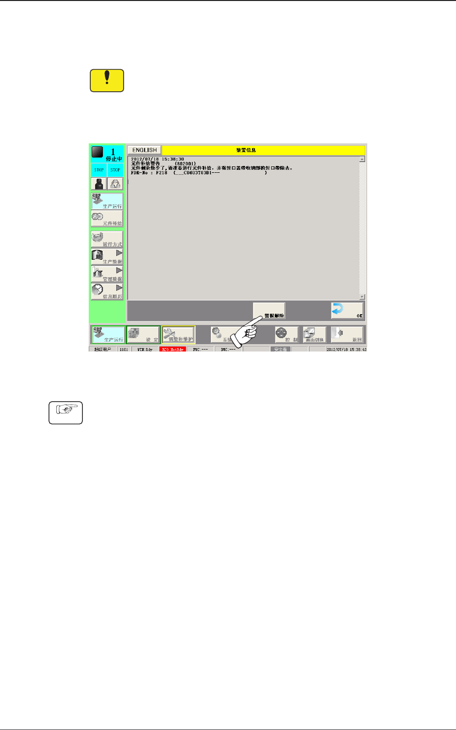 1OM-1732 3-3-5 1206-001 3.2 生产运行中补给元件时 (6) 设定补给的元件。 • 元件补给了新编带时 按[ ]( 元件补给 ) 按钮。  确认送料器一览内的余量,确认已进行元件补给。 • 元件补给了使用过的编带时 ( 编带的元件数和元件数据库中设定的数量不同时 ) 按[ ]( 交替补给剩余数 ) 按钮,在 “ 剩余数 ” 输入界面输入补给 的元件数。  确认送料器一览内的余量,确认已进行元件补给。 (7)…