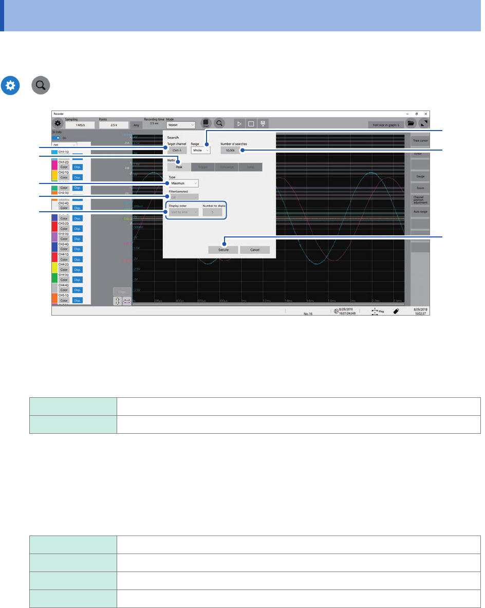 • If search results have two or more maximum or minimum values, the instrument displays any one of them as
