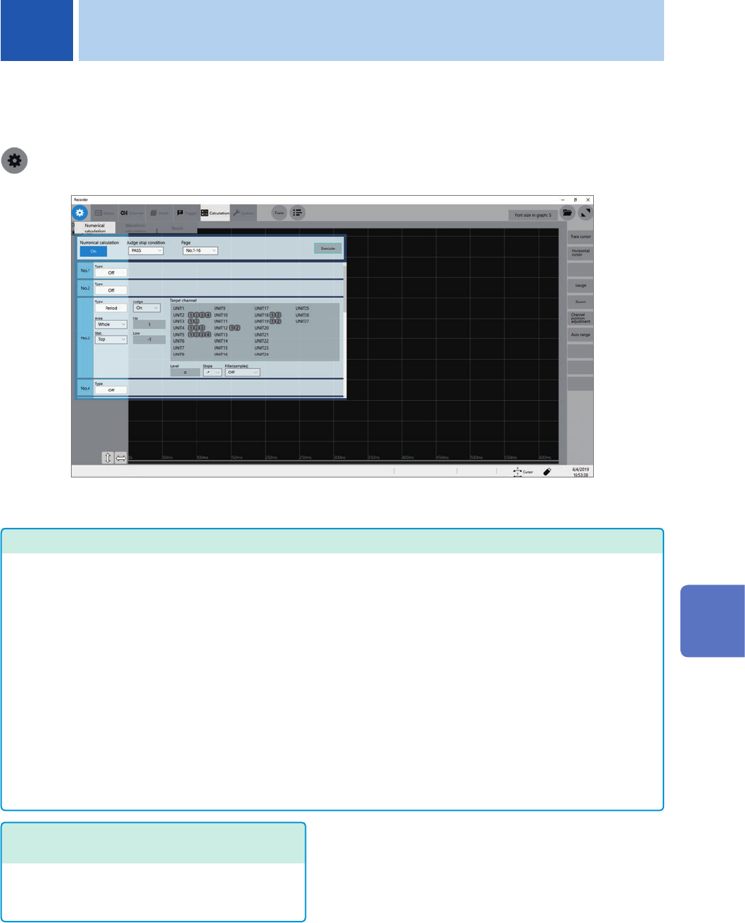 133 7 Numerical Calculation Function 7 Numerical Calculation Function The instrument makes calculations using acquired waveform data to numerically displays calculation results on the waveform screen. The instrument can …