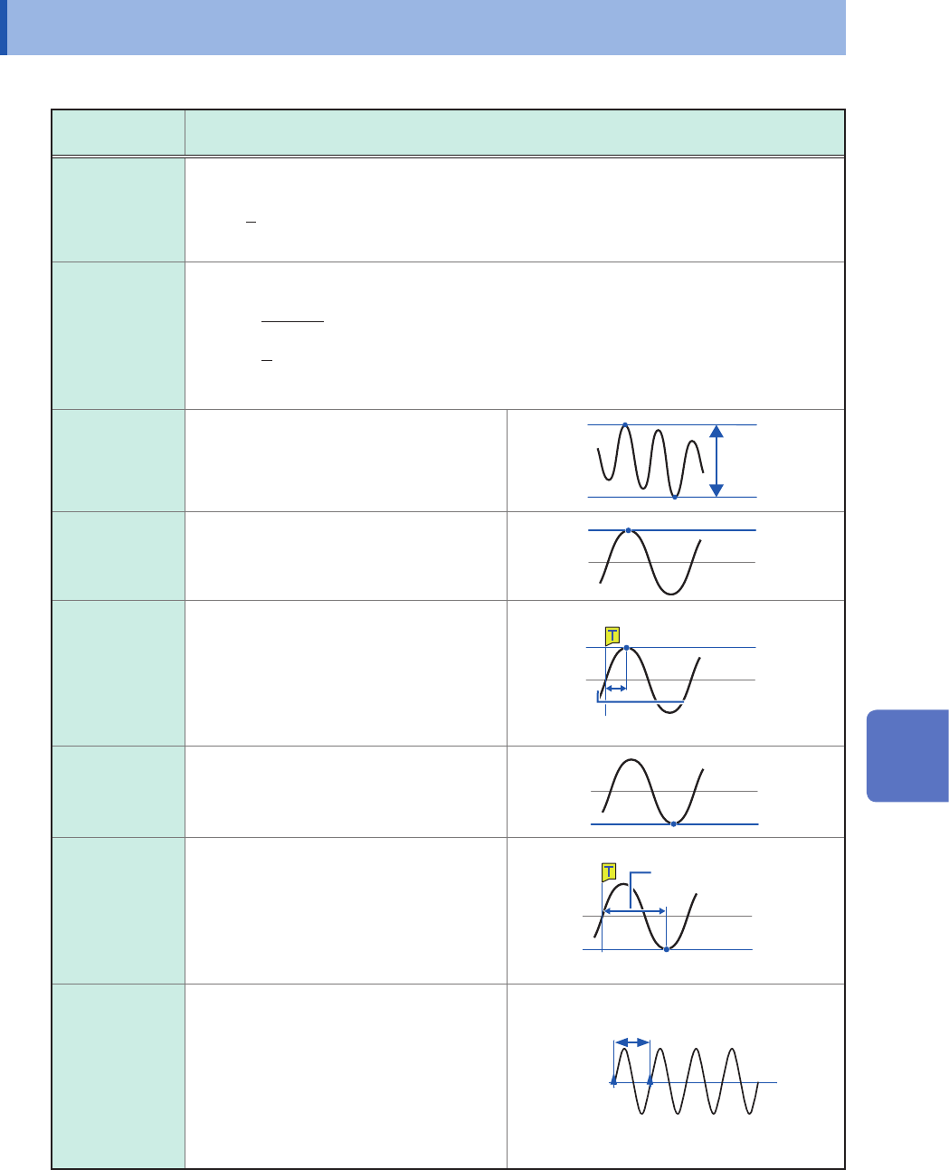 152 Numerical Calculation T ypes and Descriptions Calculation type Description Rise time Fall time Calculates a A%-to-B% rise time (or a B%- to-A% fall time; unit: s) based on the 0% and 100% levels based on a histogram …