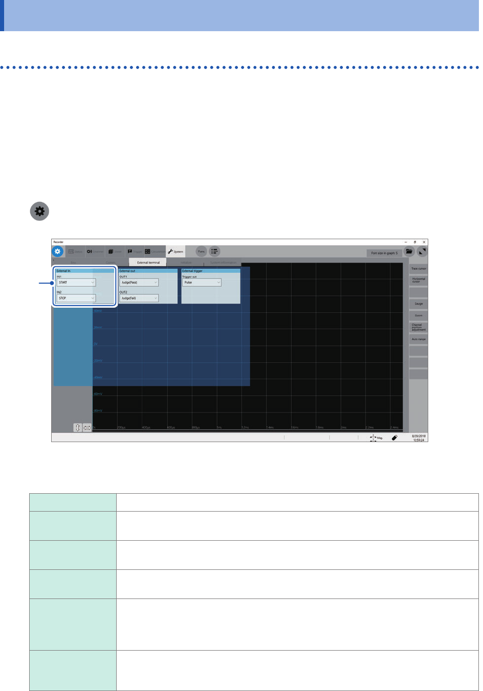 Externally inputting signals can start and stop measurement as well as save data.