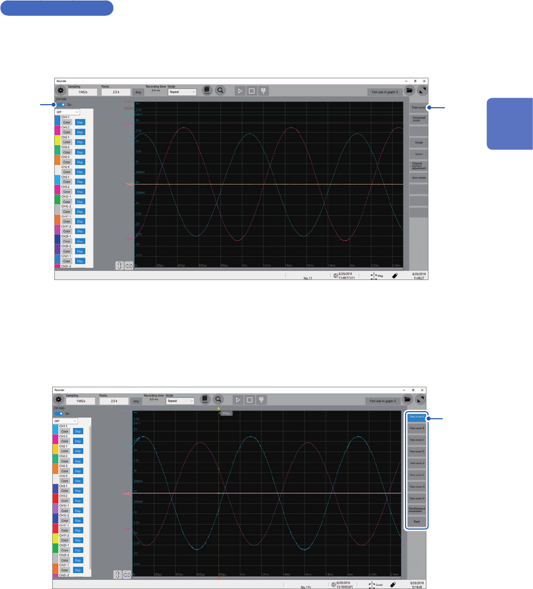 The instrument can simultaneously display up to eight cursors, which contains the trace cursors