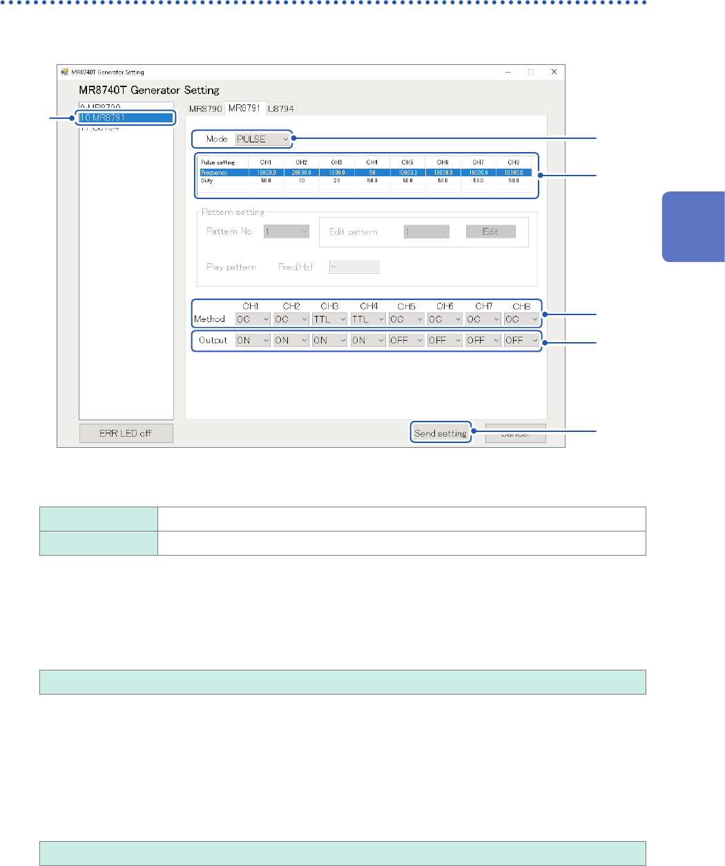 69 Conguring Generator-Module-Specic Settings Conguring Model MR8791 Pulse Generator Unit settings 1 Click [MR8791] . 6 1 3 4 5 2 2 Click the [Mode] box, and then choose an output type from the list. PULSE Outputs a…
