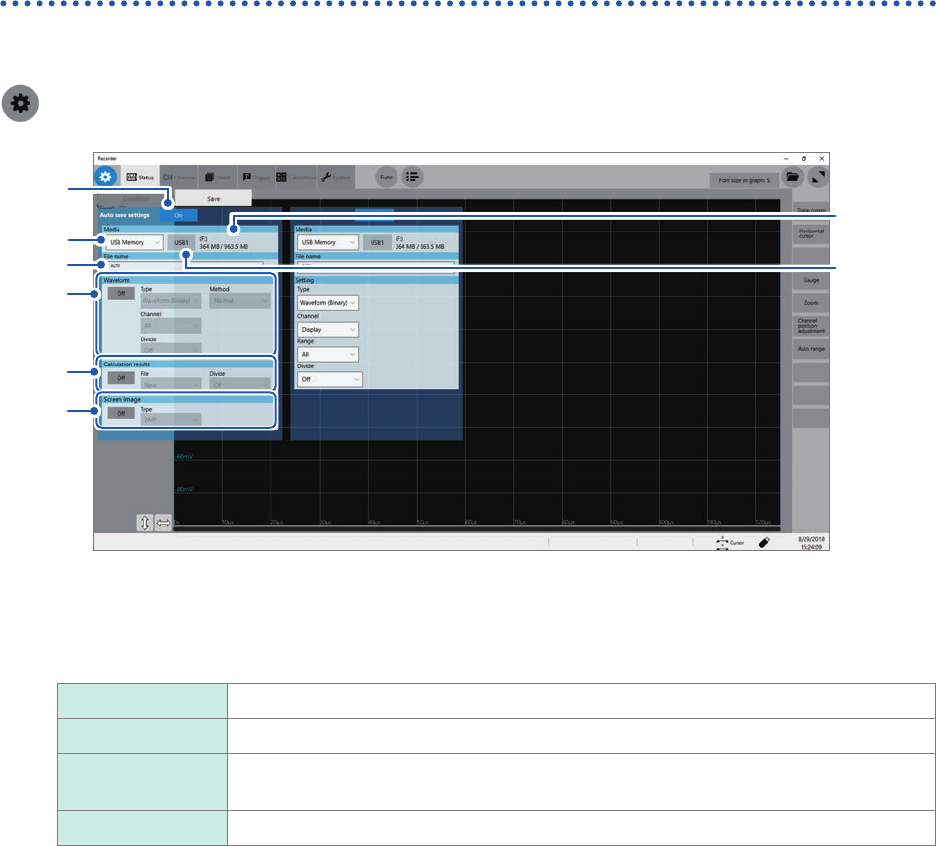 recording length. Specify a save destination and items to be saved before starting a measurement.