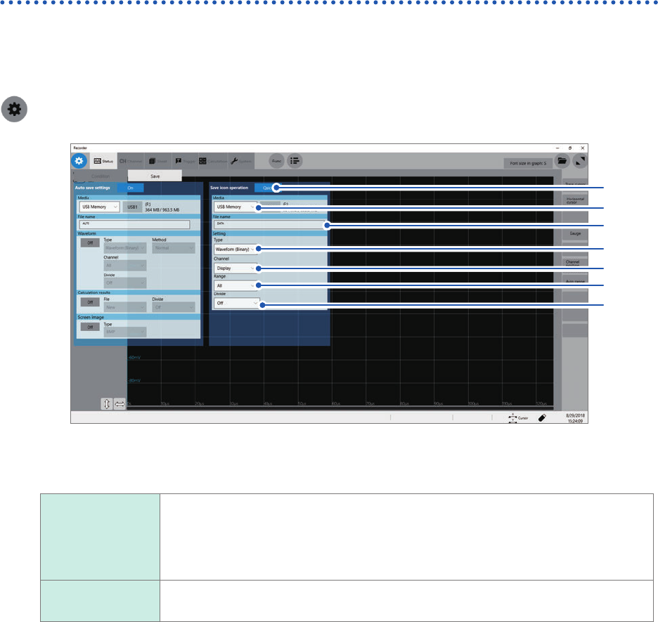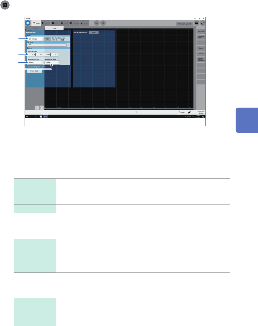 89 Saving Data > [Status] > [Save] 2 3 4 5 1 Congure the real-time save and sampling rate settings on the [Condition] screen Refer to “1.2 Setting Measurement Conditions” (p. 5). 2 Click the [Media] box, and then …