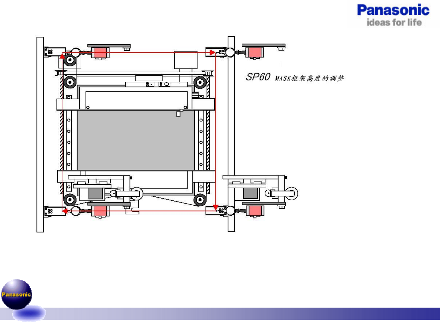 V1.0-060818 16/19 6,MASK框架高度的调整。 1. 取出 MASK 固定气缸单元 2. 将百分表至于相机单元 3. 以 MASK 框架左前为基准,测量其他三处,规格 值: 0 ± 0.05mm 4. 若不良,调整 MASK 框架处的固定螺钉 2 粒 注意: 1. 调整前侧固定块时, 一定要将固定块紧靠定位 PIN 2. 调整后侧固定块时, 需将 MASK 固定气缸单元安 装固定后,方可调整 3. 先确认前部固定块, …
