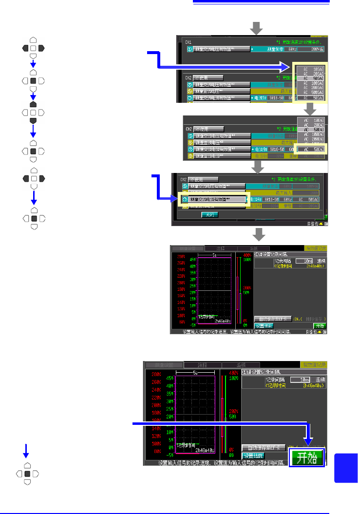 附录 7 有效值记录仪模式的简单设置 附 16 进行利用 CH2 测量交流电流的设置。 3 将光标移动到 [V 系 ] 决定 打开设置内容 选择 [200 V 系 ] 4 移动到 [ 测量交流电压有效值 ] 5 CH1 的选择完成 决定 移动到 [ 测量交流电流 有效值 ] 移动到 [ 电流钳 ] 决定 打开设置内容 选择 [9018- 50] 1 2 测量频率与 CH1 通用,为 60 Hz 。