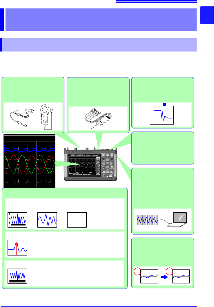 1.1 产品概要和特点 11 3 1 第 1 章 概要 本仪器是小型轻量 且操作简便的波 形记录仪。可利用电池 进行驱动,即使发生 异常,也可以 在短时间内恢复使用。可在 画面上观测和运算已测量数据, 在连接到计算机上之后,还可以 利用本仪器专用的应用软件进行分析。 概要 第 1 章 1.1 产品概要和特点 记录异常时的波形 使用触发功能进行记录 , 可进行 异常时的分析。 ( ⇒ 第 53 页 ) 测量及设定数据的保存、 读取和文件管…