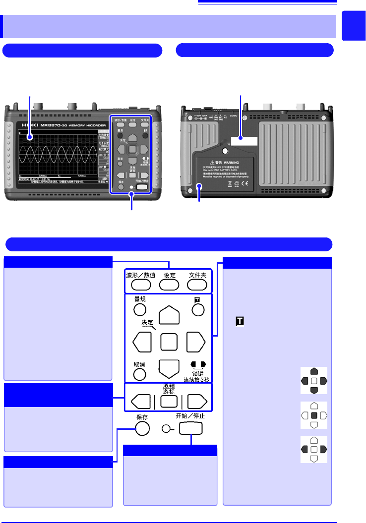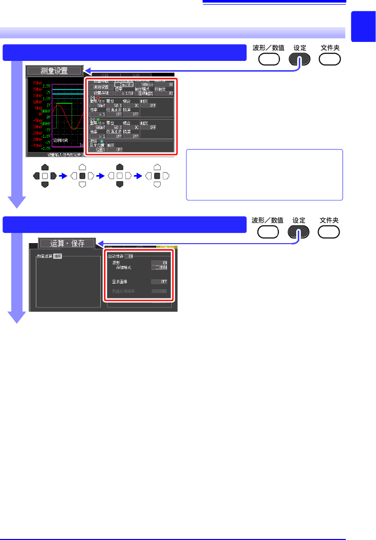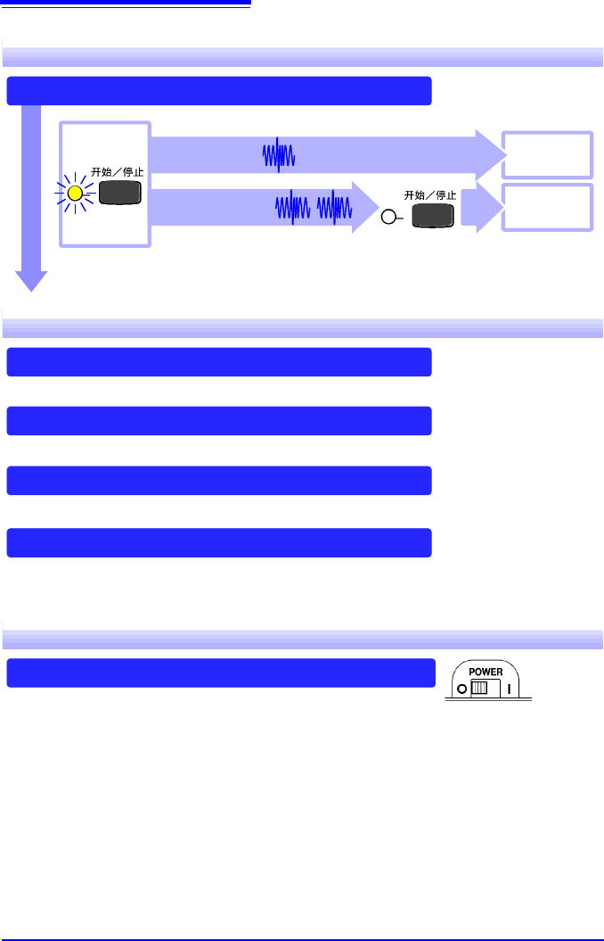 1.2 测量流程 14 测量开始~结束 测量结束 按下开始 / 停止键 ( ⇒ 第 20 页 ) 仅记录 1 次 触发 [ 单触发 ] 测量结束 测量开始 利用触发功能记录波形时,在输 入波形与设定条件相一致 的情况下开始记录。 重复记录 触发 [ 连续触发 ] 数据分析 查看测量数据 ( ⇒ 第 61 页 ) 可放大波形,确认数值。 保存数据 ( ⇒ 第 69 页 ) 可保存设定数据、波形数据、显 示画像以及数值运算结果 。 进行运算…