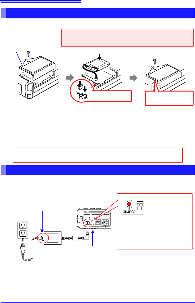 2.1 使用电池组 (选件) 26 不论本仪器的电源处于何种状态 (开或关) ,只要使用 Z1005 AC 适配器将本仪器连接到工 频电源上,即可在装有电池组的状态下充电。 安装电池组 电池组充电 准备物件 : 十字螺丝刀 (No.2) 1 把 确认 ! 请在拆下 AC 适配器并关闭电源 的状态下安装。 电池组收放盖 1 将本仪器翻过来。 用十字螺丝刀拆下固定 电 池组收放盖的螺丝, 取下 收放盖。 2 将电池组的插头连接到 接头上 ,…
