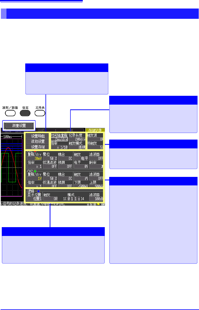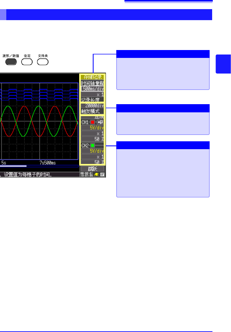 详细设定与设定画面中的设定相同。测量中,如更改量程、记录长度、触发的设置,之前的