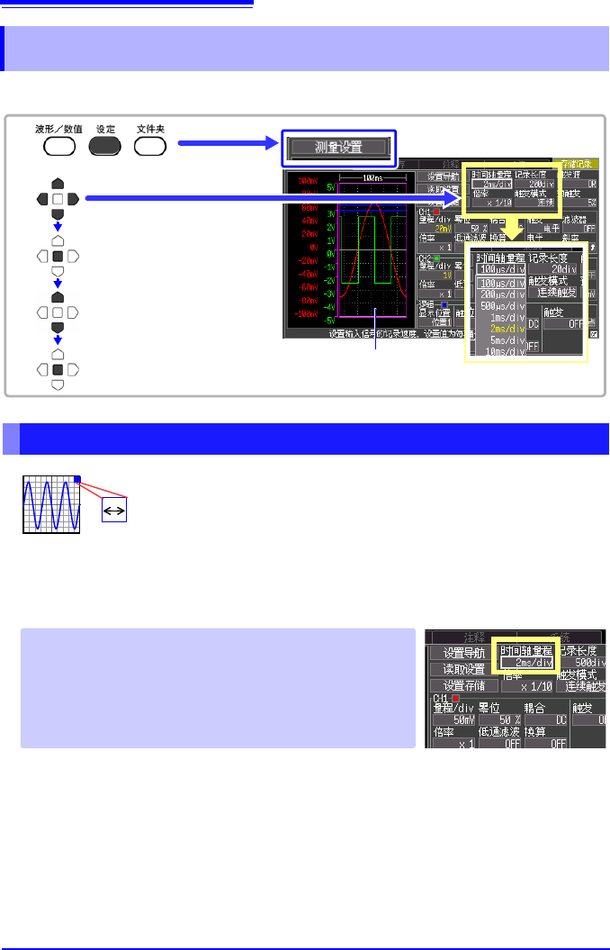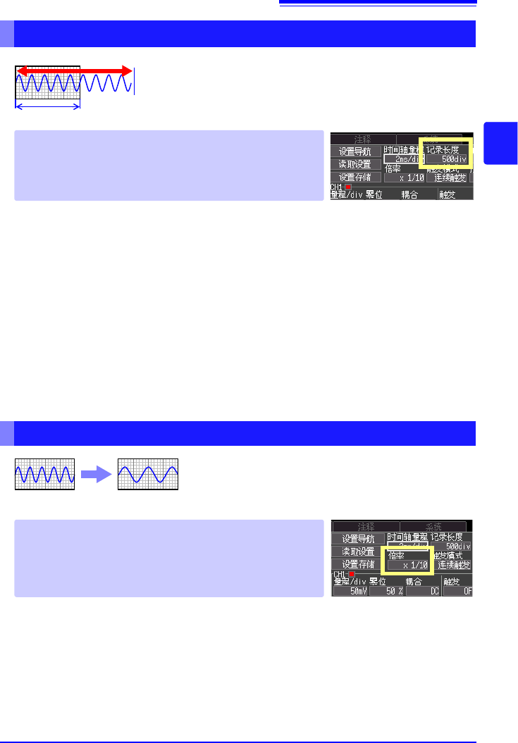3.4 测量条件的设定 1 (设定横轴) 43 3 3 第 3 章 测量前的设定 利用 di v 数设定记录长度。 记录时间 = 时间轴 (s/div) ×记录长度 (div) 记录长度 [ 连续 ] 时 • 记录长度 [ 连续 ] 可在 50 ms/div 以上的较长时间轴时进行设置。 例如,时间轴量程设为 10 ms/div 的时候,如果记录长度设定为 [ 连续 ] , 则强制将时间轴 设定为 50 ms/div 。 • 测量期间不…