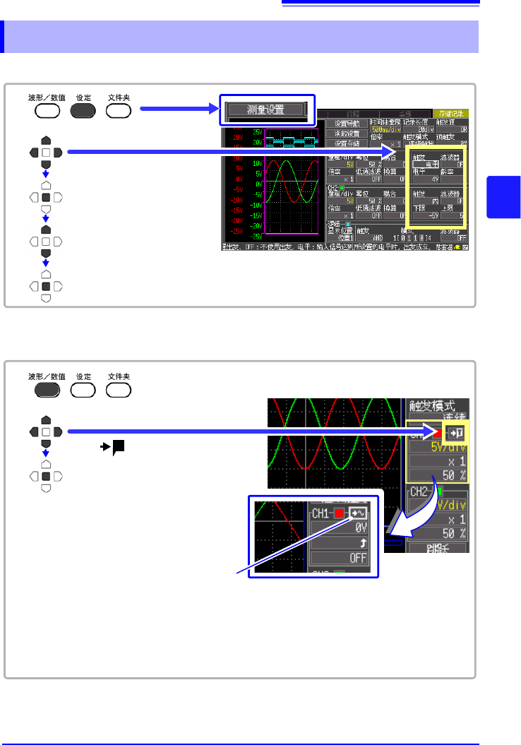 4.2 设定模拟通道的触发 55 3 4 第 4 章 设定触发 设定输入通道 CH1 、 CH2 的触发。 也可以在波形画面中设定。 4.2 设定模拟通道的触发 选择 [ 测量设置 ] 画面 选择要设定的项目 确定 打开设定内容 选择内容 1 2 显示波形画面 [ 选择 ] T 确定 1 2 显示触发设定项目。 可进行触发电平、 斜率 、 触发滤波 器以及频率的设定。 触发设定项目 需要返回到通道设定显示时 , 请再 次选择切换栏,然后…