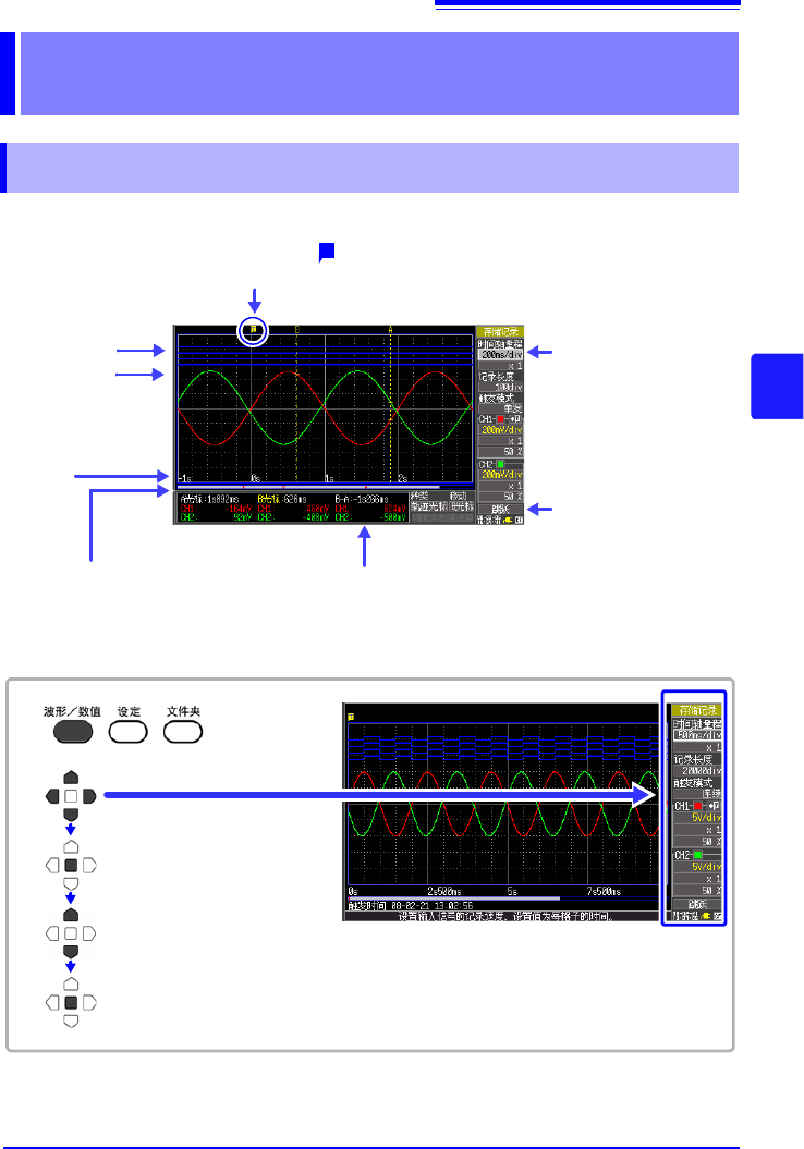 此外,显示触发的时刻、触发位置以及 A/B 光标 (使用纵向光