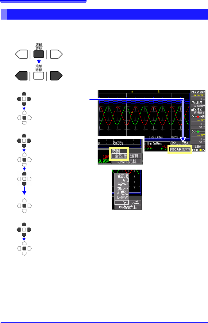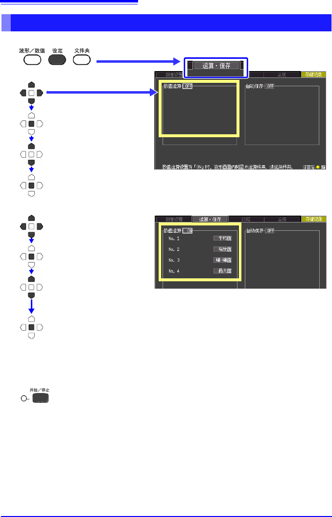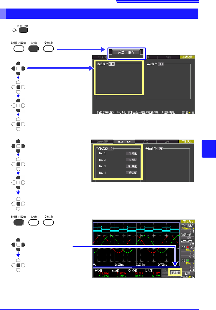 7.1 运算方法 91 3 7 第 7 章 数值运算 手动运算 选择 [ 运算·保存 ] 画面 选择 [ 数值运算 ] 确定 打开设定内容 选择 [ON] 1 2 3 确定 打开设定内容 选择运算种类 选择 : 平均值、有效值、 峰 - 峰値、最大值、最小值、 周期、频率、 OFF (初始设定) 5 分析 ( ⇒ 第 61 页 ) 波形画面中显示数值运算结果。 可变更运算种类,再次进行运算 。 测量开始、结束 4 选择波形画面 [ 运算…